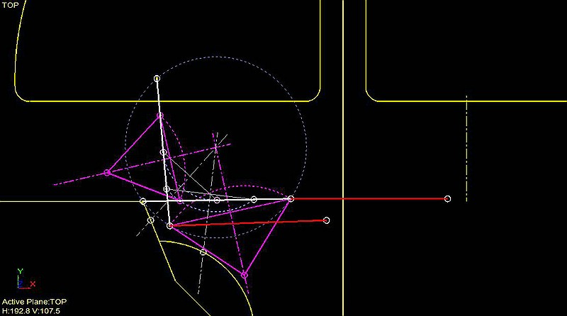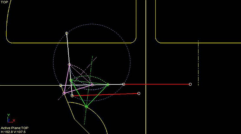 Wir kümmern uns zunächst mal nur um die Rückenlehne und nehmen an, die Sitzfläche sei an deren Vorderkante drehbar angeschlagen. An der Lehne wählen wir zwei beliebige Punkte aus, die uns geeignet scheinen, gucken, wo sie in den Endpositionen zu liegen kommen und verbinden diese beiden Lagen durch eine Linie. Über diesen so entstandenen Linien errichten wir die Mittelsenkrechten. Um deren Schnittpunkt könnten wir die Lehne direkt, ohne jede sonstige Hebelei von der einen in die andere Lage schwenken. Es ist einfach der Umkreismittelpunkt durch alle vier Endpunkte, bzw. beliebige drei davon. Alle Punkte auf den Mittelsenkrechten sind hingegen gültige mögliche Lagerpunkte für die Pendelstützen / Zweigelenkstäbe, sind also frei wählbar. Ich habe sie hier mal husch-husch auf die Schnittpunkte mit dem Karosserieblech gelegt, was so natürlich nicht geht. Unter statischen Gesichtspunkten gucken sie auch nicht gerade in die sinnvollste Richtung.