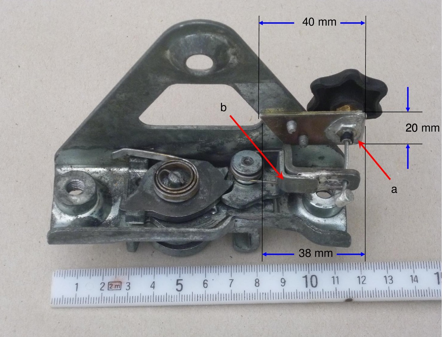 Anmerkung: Das auf den Auslösehebel aufgelötete 1,5 mm starke Blech "Pos b" kann für dieses Thema unberücksichtigt bleiben. Es stellt nur eine Option dar, um den unnötig langen Leerweg des Heckklappendrückers zu unterbinden. Dadurch wird ein übermäßiges Verkanten vermieden und der Drücker lässt sich so halt etwas leichter betätigen. Ich glaube, dass ich mir eine Beschreibung ersparen kann, denn die Bilder sprechen eigentlich für sich. Ansonsten melden, dann kann ich noch den schon fertigen Text ergänzen.