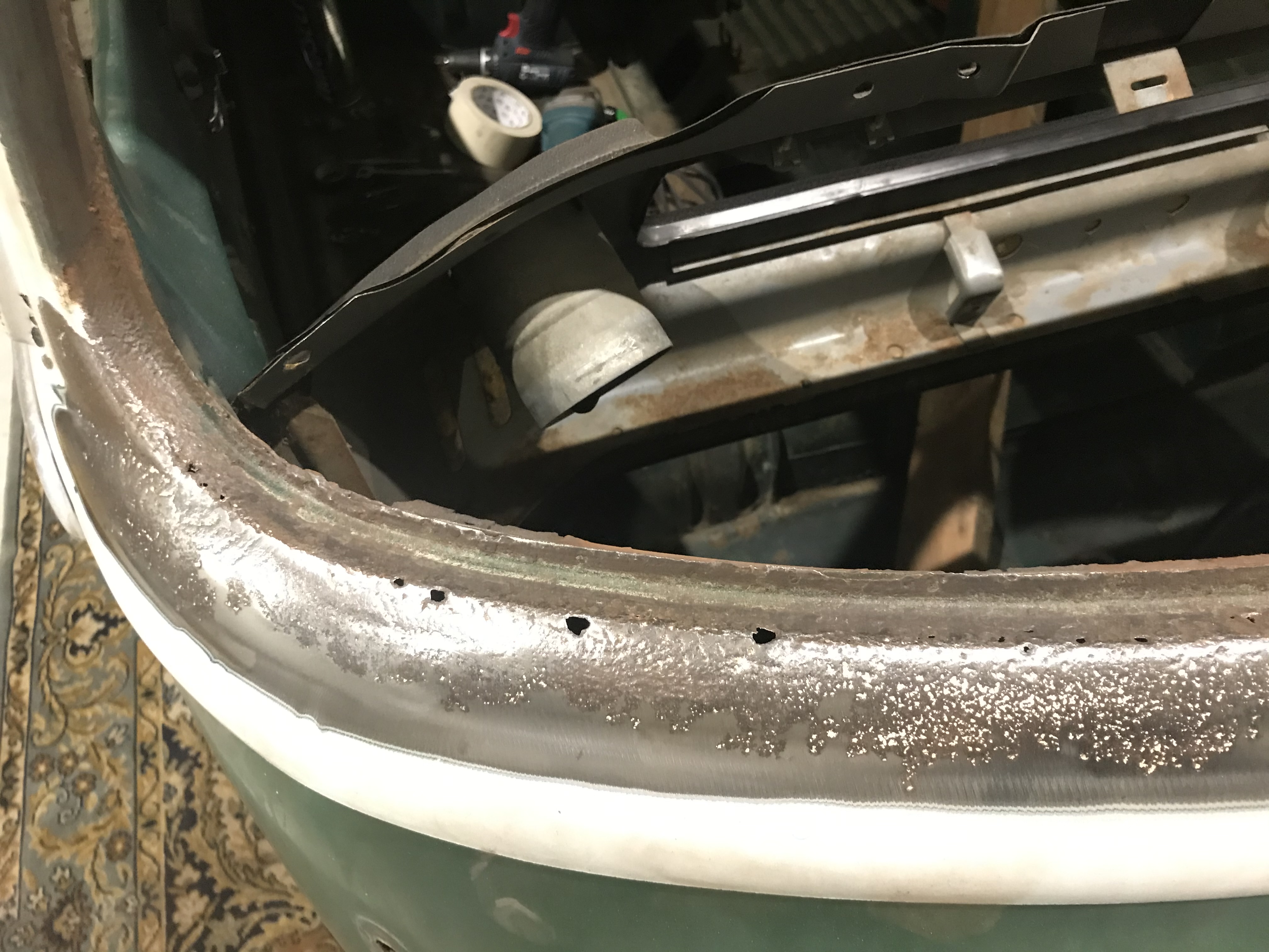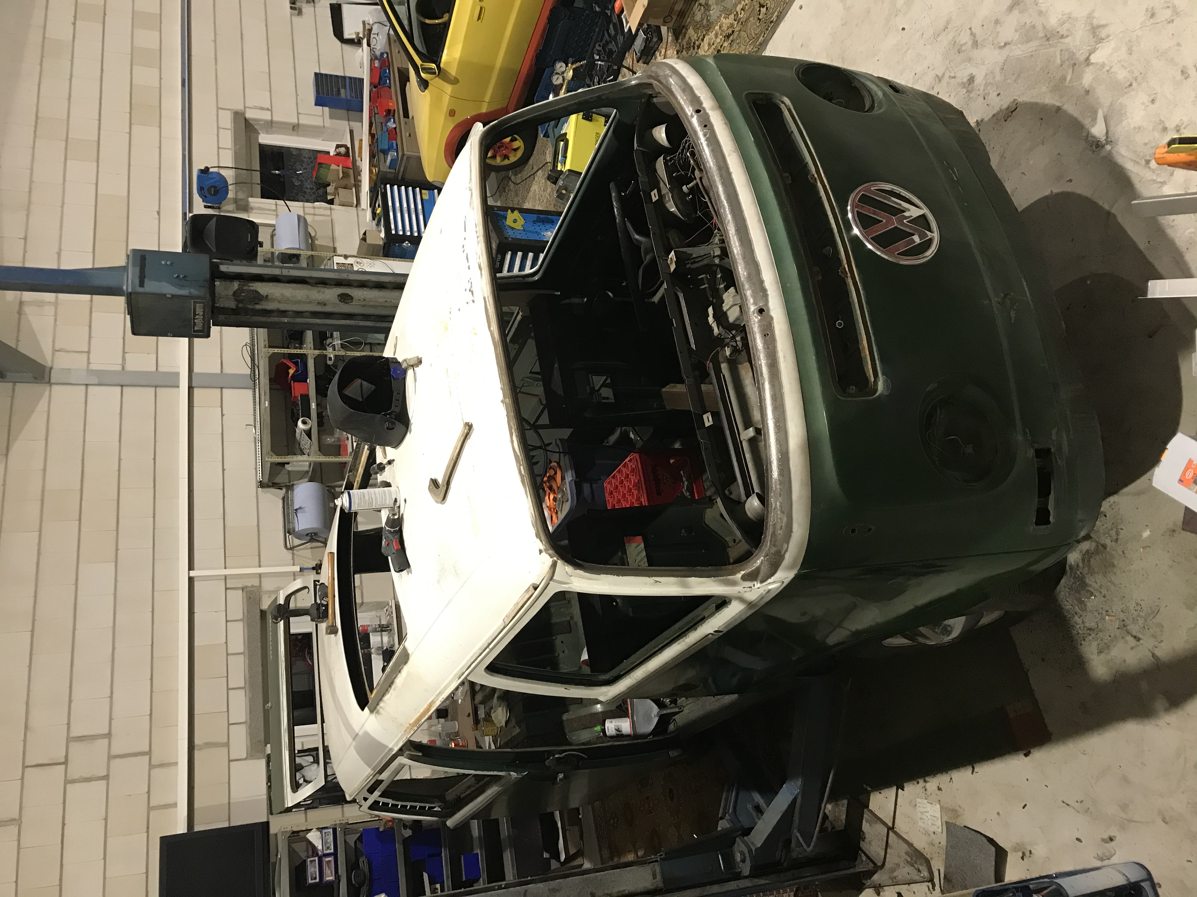 Sooooo, nach jeder Menge anderer Projekte, hab ich mir vorgenommen den Bulli jetzt mal endlich voranzutreiben. Bisschen was hat sich auch in der Zeit getan. Achsteile neu lackiert, Gelenke neu, auf Scheibenbremse umgebaut, Bremsleitungen, Bremskraftverstärker usw. neu, Kleinigkeiten wie Scheibenrahmen geschweißt und jetzt angefangen oberhalb neu zu lackieren. Der Lack war leider zu schlecht um ihn irgendwie zu retten. Zumindest nicht im Rahmen meiner Möglichkeiten. Wenn alles klappt kann ich nächste Woche Wolkenweiss lackieren, dann kann ich mich an den Innenraum machen. Ich hau mal ein paar Fotos rein.