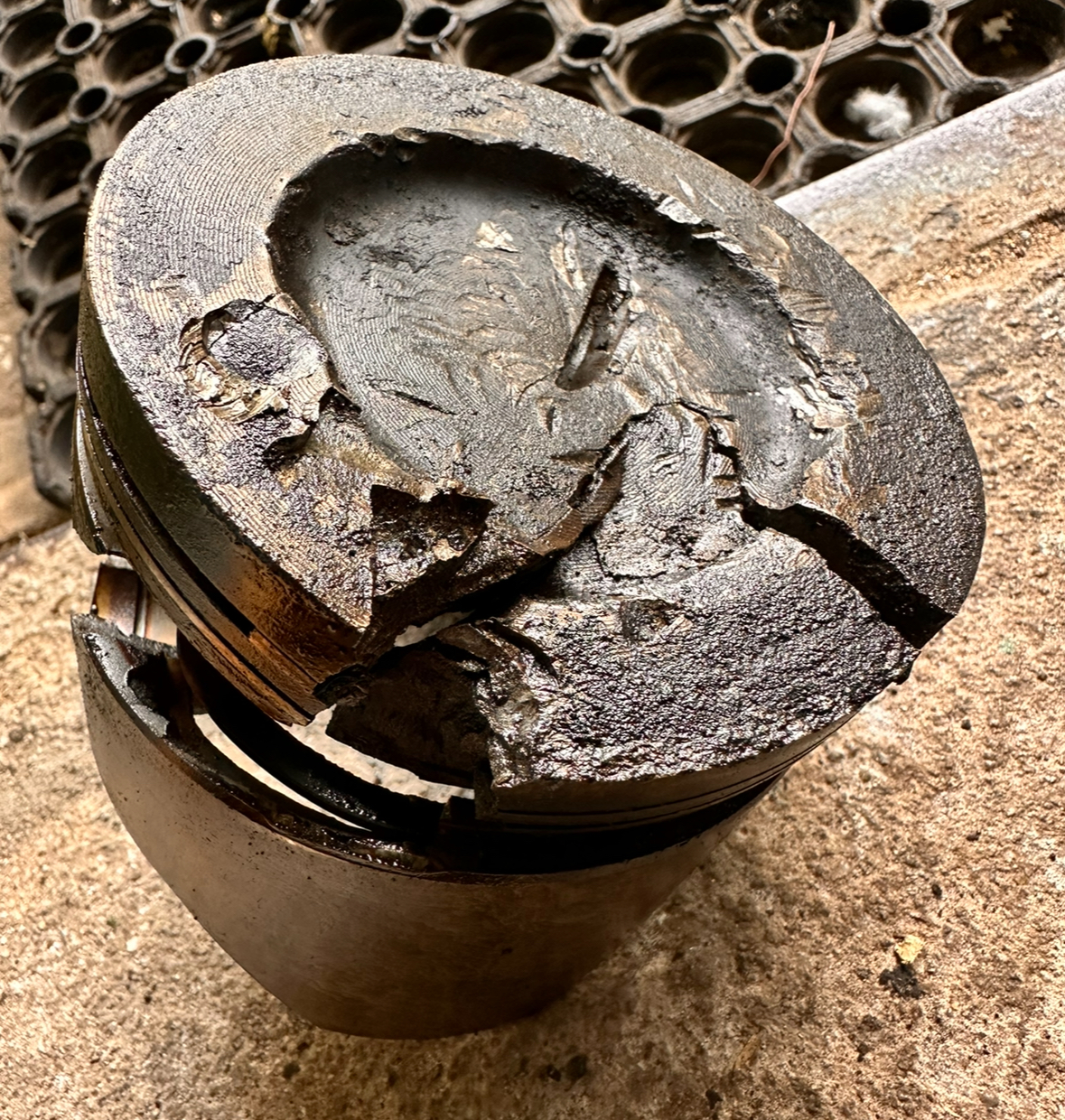 Das abgerissene Ventil ist hochkant zwischen den Zylkopf und Kolben geraten und hat diesen geteilt. Muss einen mächtigen Rums gegeben haben