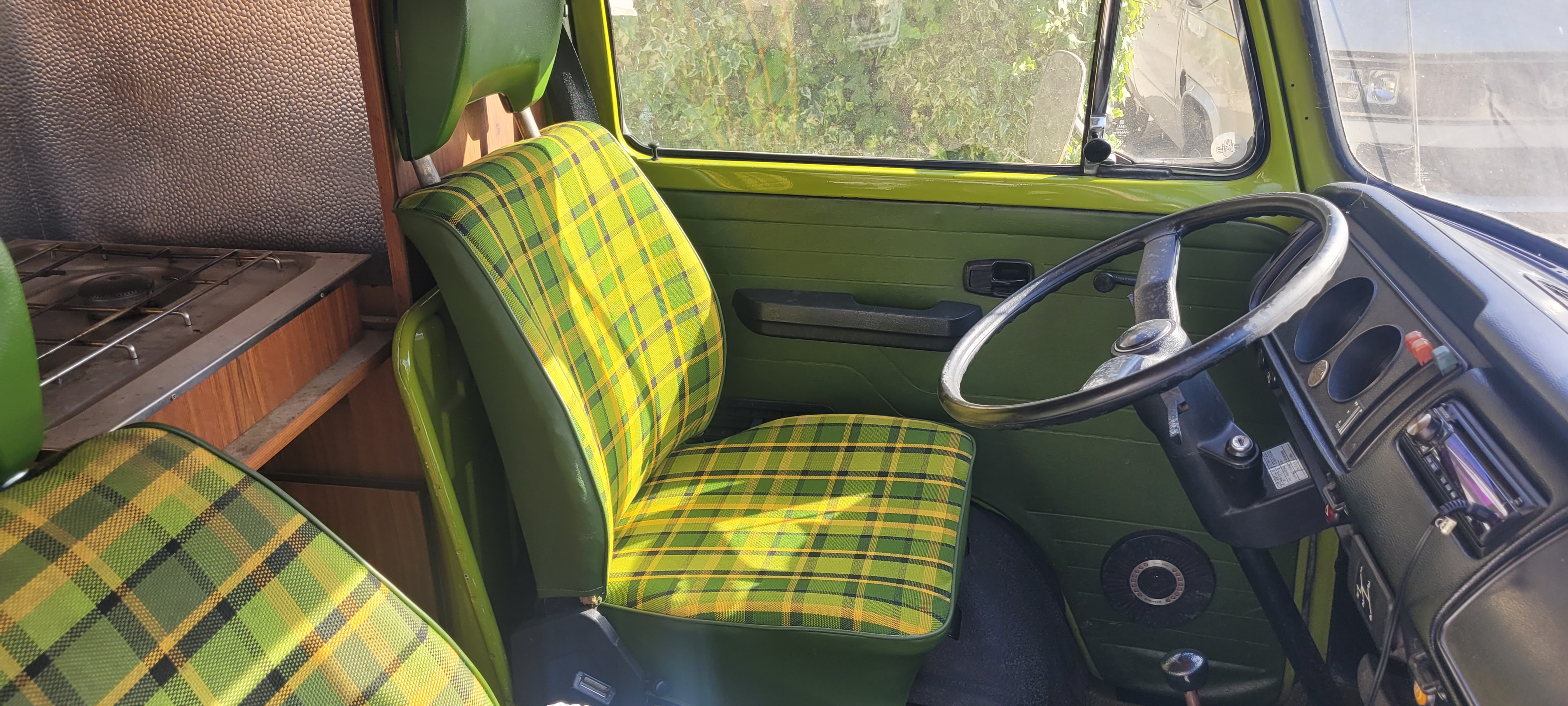Innen ist er gut gebraucht. Sitze vorne würden neu gepolstert und neuer Stoff, hinten müssten sie mal überholt werden. Holz ist teilweise abgeplatzt und der Himmel ist wellig.