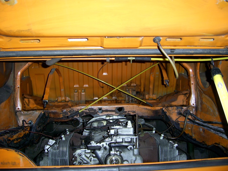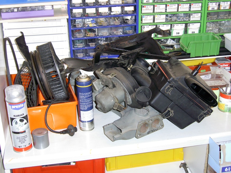 Dann dann las ich Haralds Falschluftworkshop und beschloss das auch noch mit zu prüfen ... und schwupps war ich mitten drin: Unterdruckrohre ab ... ok, die Vergaser auch noch ab und reinigen/neue Dichtungen ... die Wärmetauscher sind ja auch schon durch, also neue ... die Motorverblechung war auch schon mal schöner ... also ausgebaut und entrostet / lackiert ... na ja, wenn man schon so weit ist, dann könne man ja noch den Kübelwellendichtring an der Lüfterseite wechseln, der ölt ja ... und die Lichtmaschiene könnte auch vorsorglich neue Kohlen und Lager bekommen, wer weiß wie lange die noch machen, die haben ja auch schon 100.000km hinter sich ... Gebläsekasten raus ... na gut, der Ölkühler auch ... und so kam es das da nur noch der Rumpfmotor eingebaut war
