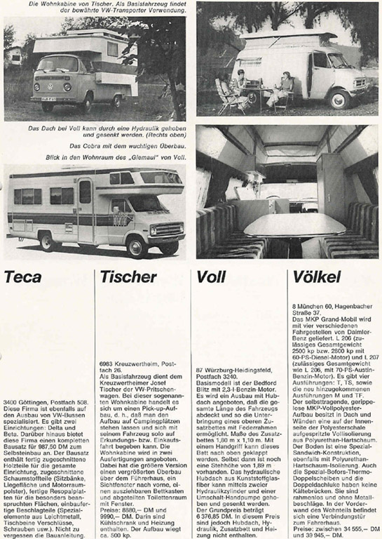Im Vorspann der Übersicht heißt es, dass in Deutschland damals rund 12.000 Camper angemeldet waren und dass es ca. 30 Hersteller von Wohnmobilen gäbe. Außerdem steht da noch der schöne Satz: "Die Käufer von Reisemobilen und Campingbussen sind in erster Linie Akademiker, Selbstständige und ... Abenteurer". Wenn dem immer noch so ist, dann haben wir hier wohl viele akademisch-selbstständige Abenteurer.