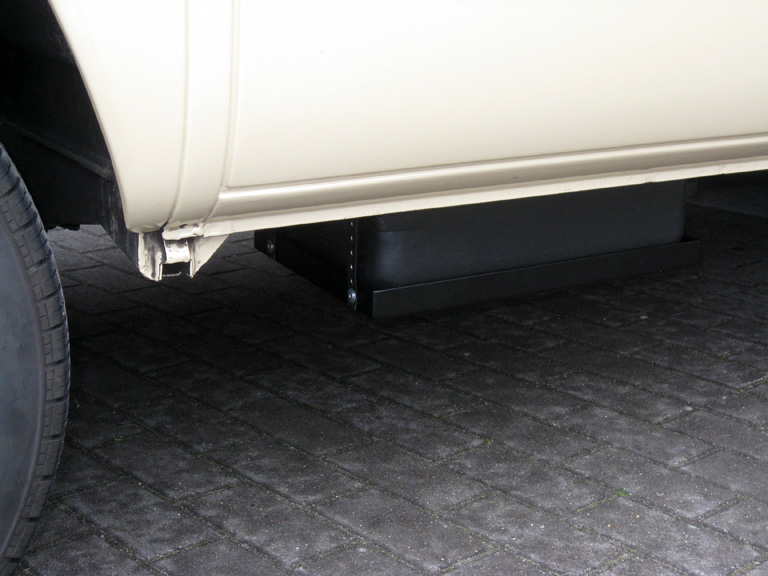 Anstatt des etwas vorstehenden Original-Deckels des Reserveradkastens habe ich eine praktische Tür montiert. Dadurch habe ich wieder etwas mehr Platz im Durchgang nach vorne gewonnen, denn der Kühlboxschrank (nein, KEIN Toilettenschrank) steht bei mir ja hinter dem Beifahrersitz.