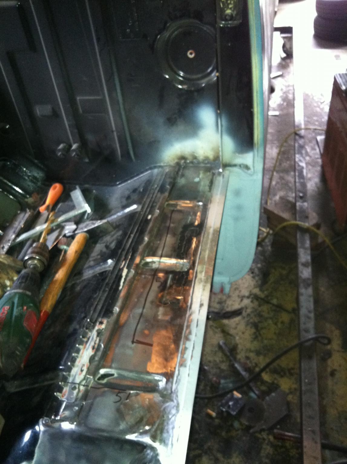 So nicht das ihr denkt hier geht nix mehr voran und ich hätte aufgegeben :D .Hier mal noch ein Paar Bilder.Kommentare und Verbesserungsvorschläge sind natürlich immer gerne gesehen.So stand der Dinge ist:zweiter Schweller beide Wagenheberaunahmen und vorderer Ausleger eingeschweißt,linke B Säule instandgesetzt(Natürlich mit Hardtops 1a Reperaturblech danke dafür),Radlauf inklusive Gurthalter instandgesetzt,zweites Kniestück rausoperiert,hintere linke Ecke rausgeschnitten neue angepasst und eingeschweißt und zuguterletzt das Frontblech aufgeschnitten um mal eien Blick dahinter zu werfen.