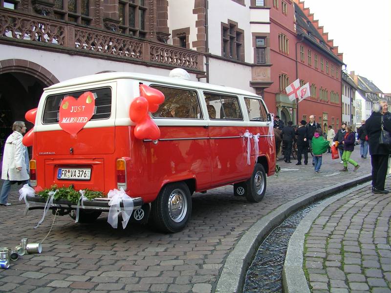 Mein Bus war 2009 für ein befreundetes Paar das Hochzeitsauto. Die Hochzeit war im schönen Freiburg, eine Aufnahme ist direkt vor dem Rathaus mit einem freiburger "Bächle" vor dem Bus.