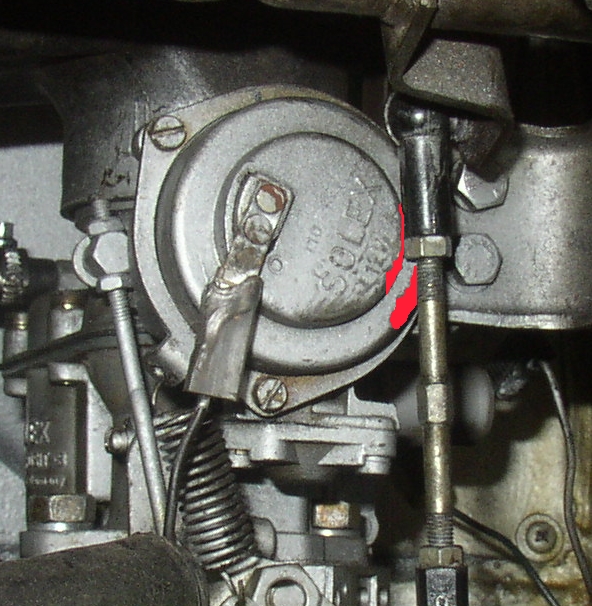 Da sitzt das Querrohr, an dem die beiden Zugstangen mit Kugelköpfen und der Gaszug angreifen, zu weit links.