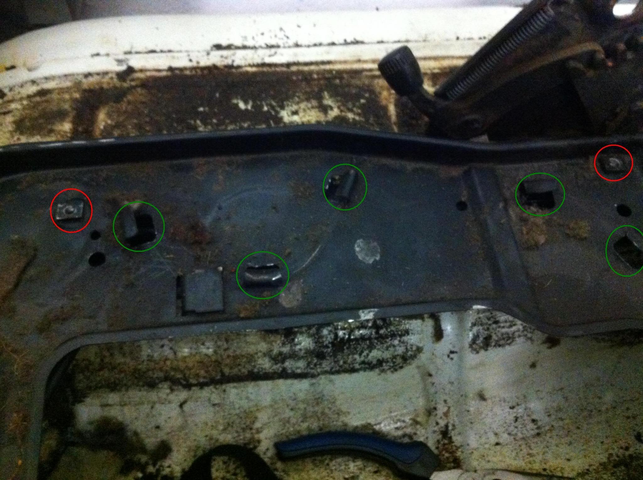 grün: Haltelaschen für die Federn / rot: Befestigungsschrauben
