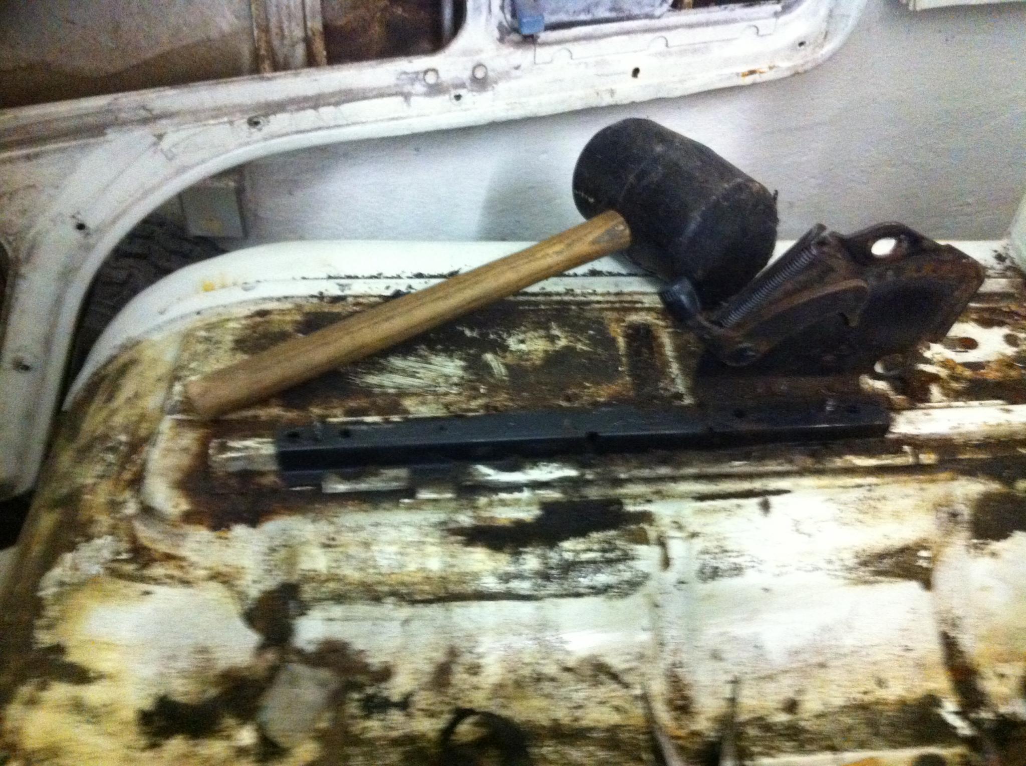 Aufgrund der beengten Platzverhältnisse ist die angegammelte Sitzschiene für wirksame Hammerschläge kaum zu erreichen.