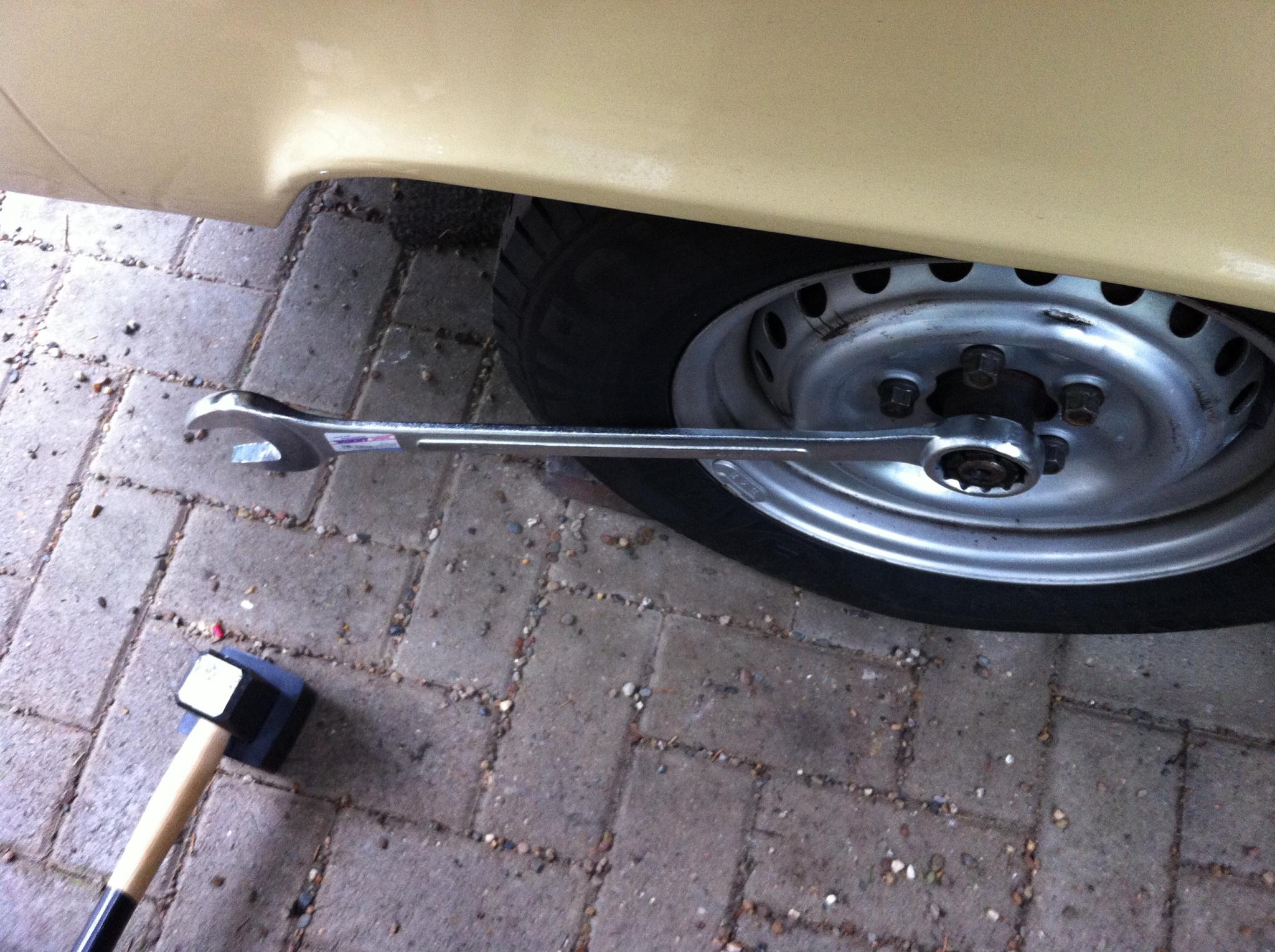 Rolf-Stephan gedacht, der so schön beschrieb, den Bulli noch über den hinter den Reifen gelegten Stein gedreht zu haben. Ich habe auch immer wieder auf das Gewinde geglotzt, weil ich dachte, dass das vielleicht ein Linksgewinde wäre. Aber nein – ich kriegte einfach nicht genug Kraft auf die Nuß.
