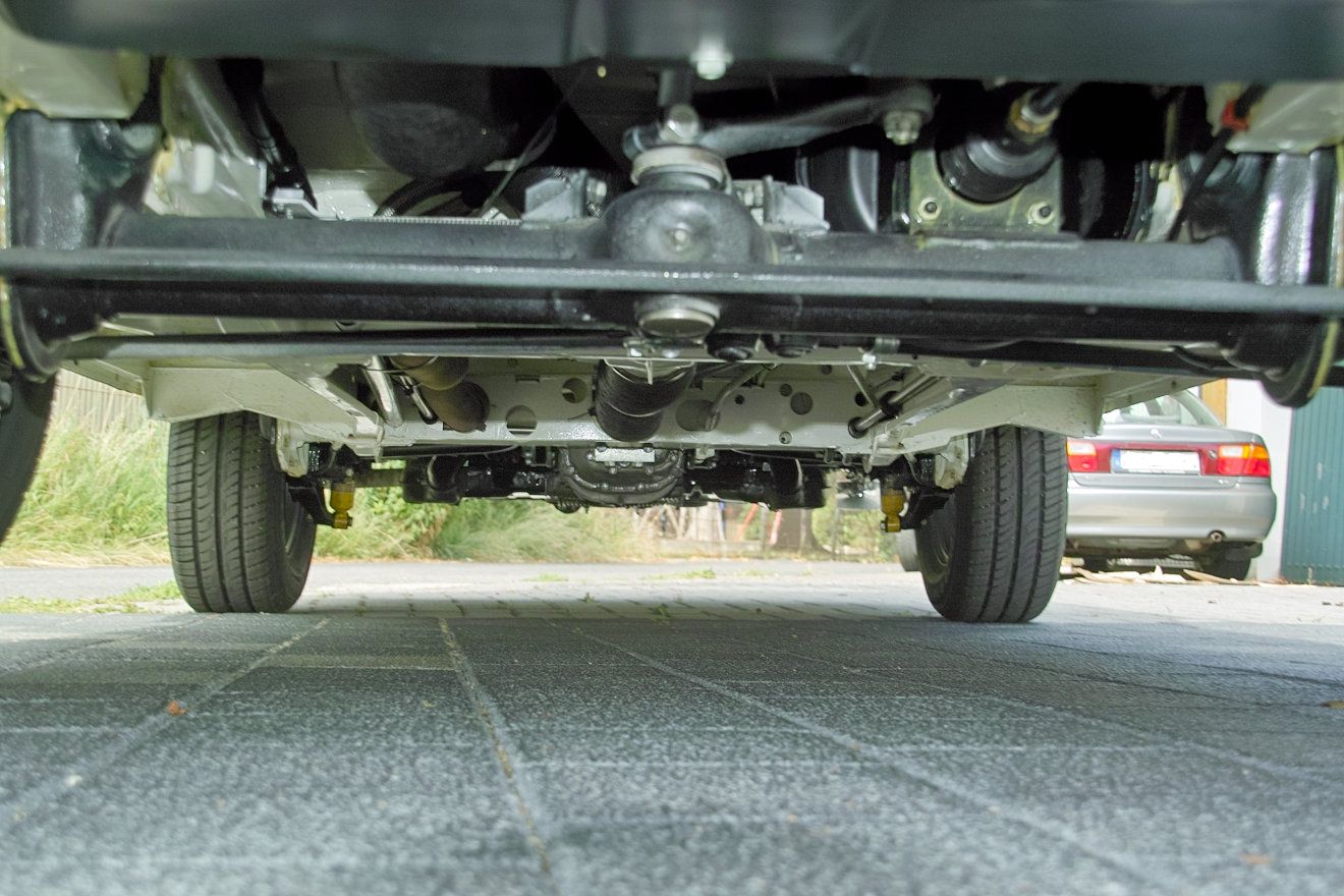 Ich habe ihn von unten weiß lackiert, weil das nach meinen Recherchen bei zweifarbigen Lackierungen so war. Auf den U-Schutz habe ich aus bekannten Gründen verzichtet. Ich warte mal ab, wie sich das in den Radhäusern entwickelt. Vielleicht kommt dort noch ein Steinschlagschutz rein (Schwarze Pampe oder Innenkotflügel oder so). Bei anderen Oldies hat sich der Lack untenrum bisher gut gehalten. Allerdings wird der Bus mehr gefahren werden und das Reifenprofil sammelt mehr Steine auf. Andererseits fahre ich mit ihm langsamer - ich werde berichten. Ich habe vor der Lackierung alle Nähte sorgfältig mit Karosseriesichtmasse versiegelt, dabei aber alle nach unten gerichteten Nähte offen gelassen, damit das Wasser raus kann. Einige Kanten habe ich mit Kantenschutzprofilen versehen, die mit Mike Sanders gefüllt wurden. Das zieht jetzt langsam zwischen die Bleche. Zum Winter kommen die Kantenschutzprofile wieder ab. Über Spritzlappen denke ich zur Zeit noch nach. Die würden das Spritzwasser etwas von den Camping-Öffnungen im Boden abhalten (Gasflaschenentlüftung, Abwasser, ...).