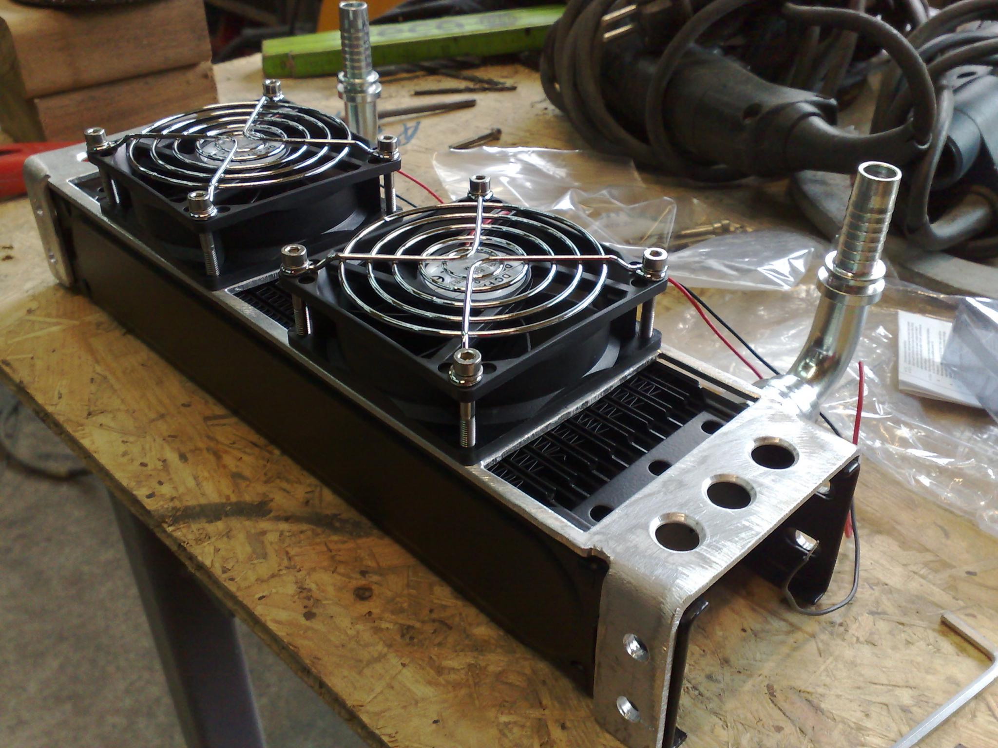 Ich habe zusätzlich noch zwei kleine, wasserdichte 12V Lüfter hinter den Kühler montiert, welche im Bedarfsfall zuschaltbar sind und die heiße Luft aus dem Kühler ziehen.