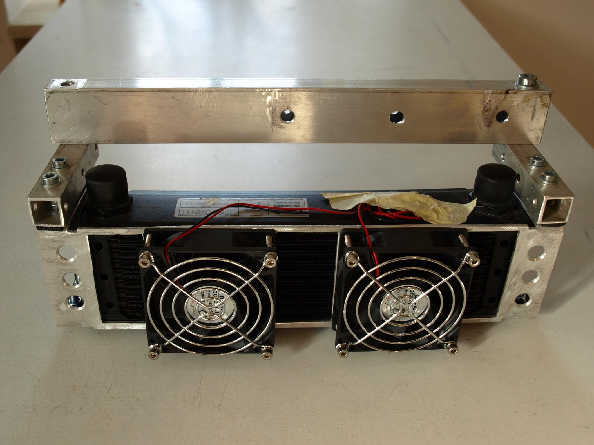 Ich habe zusätzlich noch zwei kleine, wasserdichte 12V Lüfter hinter den Kühler montiert, welche im Bedarfsfall zuschaltbar sind und die heiße Luft aus dem Kühler ziehen.