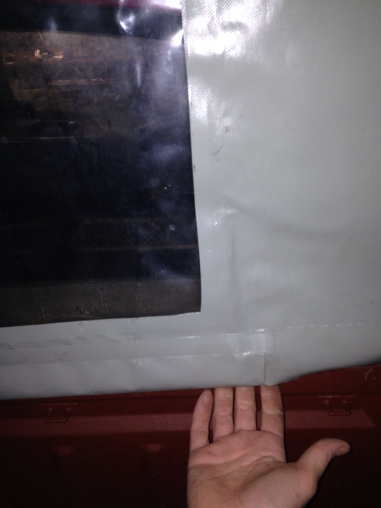 so wie von David beschrieben, habe ich meine Plane auch anfertigen lassen. In den Hohlraum habe ich einen Flachstahl, ca. 1m lang, Querschnit etwa 5 x 30 mm eingeschoben. Sieht man auf den letzten beiden Fotos. Obwohl ich den Flachstahl nicht verschraubt habe, bleibt er während der Fahrt auch in der Hülle liegen (Foto 3). Das Problem ist nur, dass er offensichtlich zu leicht ist, und die ganze Sache wird dann doch nach innen gedrückt (Foto 2).