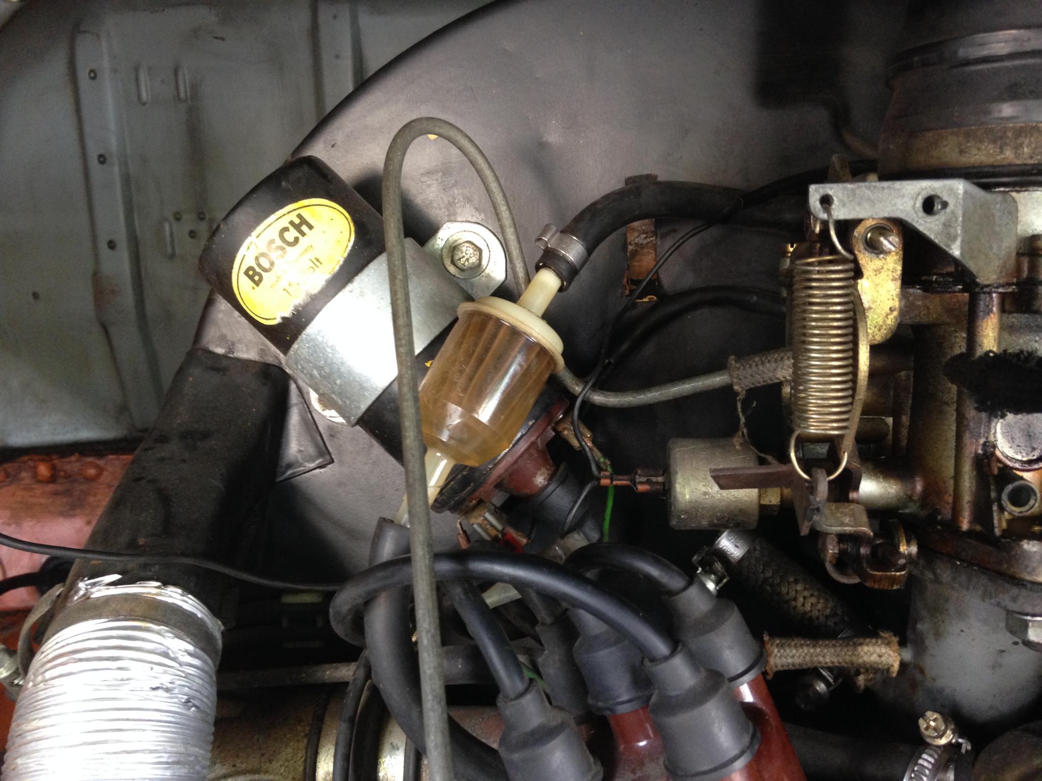 Wenn er auch beim Orgeln leer bleibt, dann spricht das deutlich für die Dampfblasendiagnose. Guck mal, ob die Benzinpumpe sich irgendwo allzu innig an die Lichtmaschine anschmiegt. Ist auf den Fotos schlecht zu erkennen, ob die evtl. Kontakt zur Befestigungsschelle der Lima hat. Auch kann man die Zuleitung nicht erkennen. Die sollte auch nicht gerade auf der Saugrohrvorwärmung aufliegen.cuki hat geschrieben:In der Spritleitung häng so ein Bezinfilter und der ist in der Regel bei mir immer mit Sprit gefüllt. Als der Bus aber auf der Raststätte nicht mehr ansprang war er leer, ergo mit Luft gefüll ?!