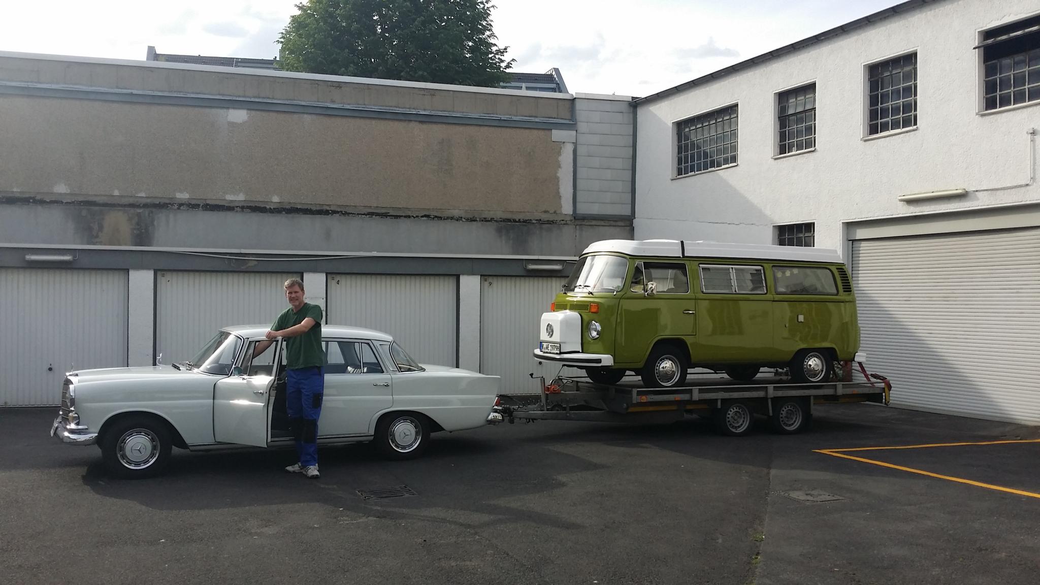 Gespannbild mit T2 mal anders. Umzug in die neue Garage, wo bald der neue Motor eingebaut wird.