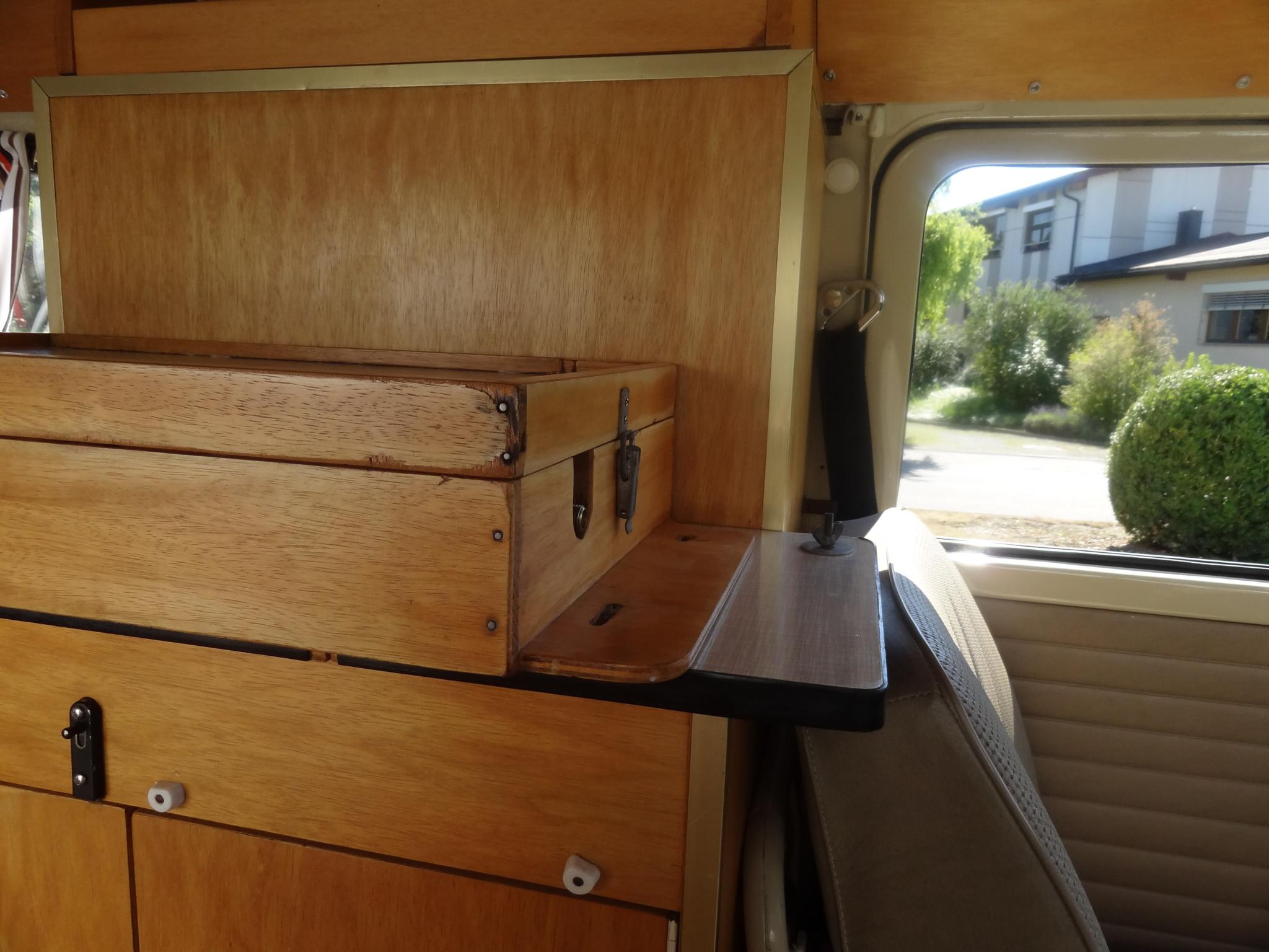 Bei Bedarf wird die Wendeküche, nur noch an der einen Schraube befestigt, über die Fahrersitze gedreht (meine ich)