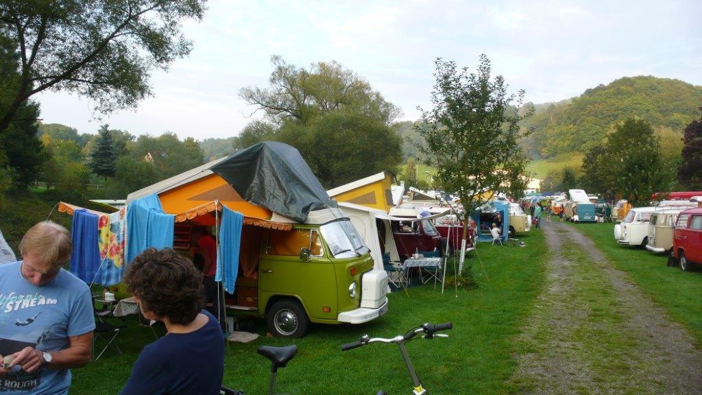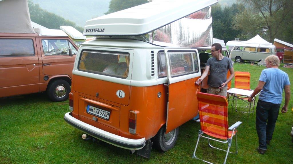 überall auf dem Platz wurden Fachgespräche im kleineren Kreis geführt. Hier zu sehen wie Roland, nebst einer Abordnung vom Stammtisch-Süd und Ruhrgebiet total vertieft sind in irgendwelche Gespräche rund um den T2. Unterdessen hat sich Sharky klammheimlich aus dem Staub gemacht