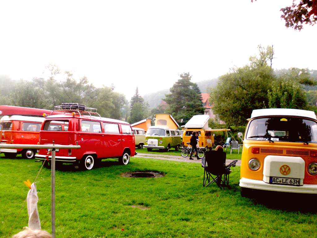 Da auch Petrus größtenteils mitgespielt hatte, war die Stimmung bis auf einen Ausrutscher (es gibt halt immer Leuts, die 30 Euro für Platz, Zelt, Lagerfeuer mit Holz, Fackelbeleuchtung, Grill, Ausfahrt, Brötchen usw. nachverhandlungswürdig finden; unglaublich, oder?) wie gewünscht: gemütlich und familiär. Viele tolle Busse und Leute am Platz, genaugenommen 90 Teilnehmerfahrzeuge. Warum wir trotz der relativ zentralen Lage die übliche 100-Grenze nicht erreicht haben wird mir ein Rätsel bleiben. Zu indifferente Wettervorhersage, kein Strom oder gar kein Empfang? Für Busfahrer eigentlich bislang nie ein Kriterium. Seis drum, mit denen, die vor Ort waren, hatten wir viele schöne Stunden. Und Roland und ich haben in der Tat um vier die Lampen ausgepustet, als alle im Bettchen waren - aber das war am Freitag Abend. Samstags war dann die Havanna-Crew in der Führungsposition...