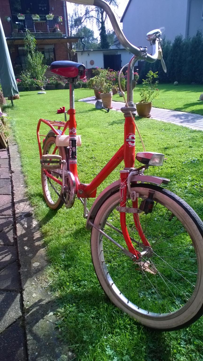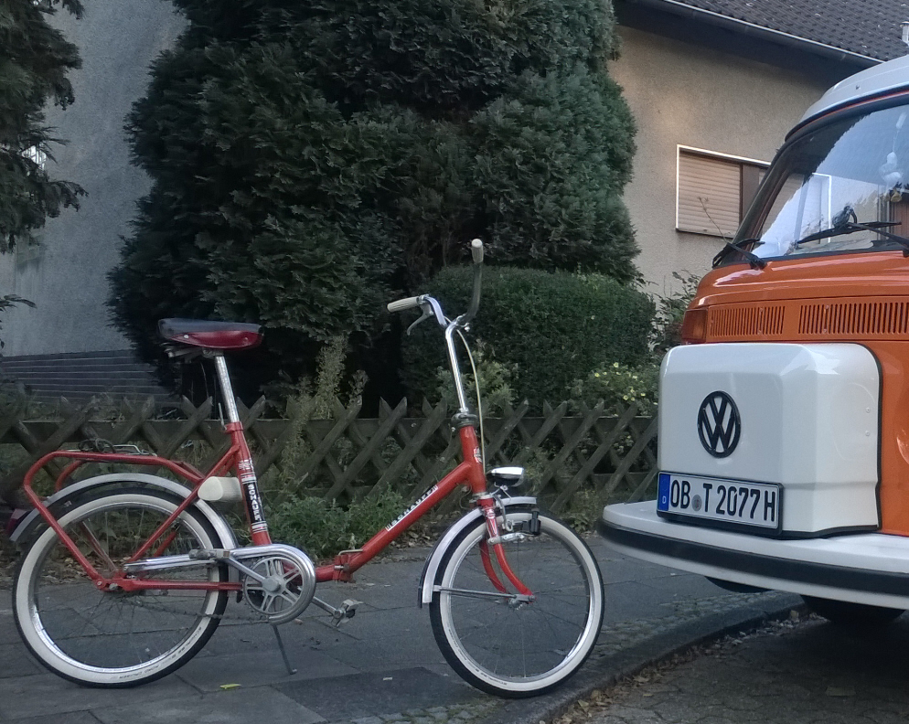 ... habe ich zugeschnappt ... ein echtes originales leuchtoranges "Schauff"-Klapprad für 27€, echt toll das Ding, alles ist dran, sogar die Werkzeugbox, alles funkioniert, Licht, Klappmechanismus einfach alles. Nicht so wie die abgerittenen Räder die für um 70€ in Bockhorn standen. Und dann noch in meiner Wagenfarbe, einfach irre, das wird mein Herbstprojekt, alles demontieren, reinigen, polieren, neue Weisswandmäntel drauf und fertig. Habe schon früher alte Fahrräder restauriert, fahre u.a. noch ein 62er Göricke mit kompl. erhaltener Patina, wunderschönes Ding. Das Klapprad wird uns wohl auf einigen Touren begleiten, morgens zum Brötchen holen, oder mal eben zum Ort einkaufen. Werde es evt. in der Gepäckwanne transportieren, mal sehen. Freue mich jedenfalls sehr über das Schnäppchen. Genau das Richtige für einen Kurzurlaub wo man nicht den Träger auf der Anhängerkupplung mitschleppen will.