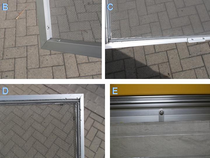 Bild B zeigt die Eckverbindung von innen her betrachtet, C verdeutlicht die Fixierung für unten in der Mitte, praktisch ein aufgenietetes Blech (Ansicht von außen). D (ebenfalls Außenansicht) veranschaulicht, wie das Fliegengitter vom Keder eingeklemmt ist. E ist die Fixierung für oben vom Innenraum her betrachtet, es ist nur eine Blechlasche senkrecht zu stellen, fixiert mittels Schraube und Gegenmutter unter leichter Vorspannung. Insgesamt sitzt der Fliegengitterrahmen recht stramm im eigentlichen Fensterrahmen, da klappert auch nichts bei der Fahrt.