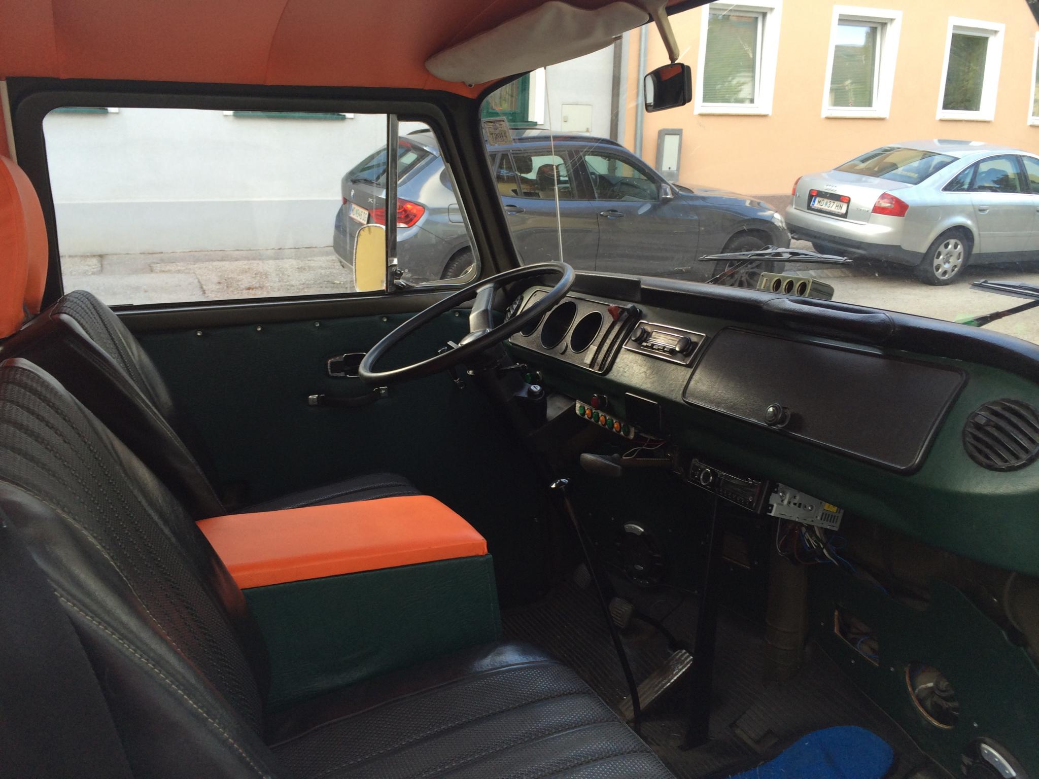 Der Preis für eine gute Basis war meiner Meinung nach in Ordnung, innen wurde alles mit orangen und grünen Leder überzogen, eine Musikanlage wurde eingebaut mit kräftig Bums, Neonlichter, Spannungswandler, 4 x 220V Steckdosen, zweite Batterie usw.