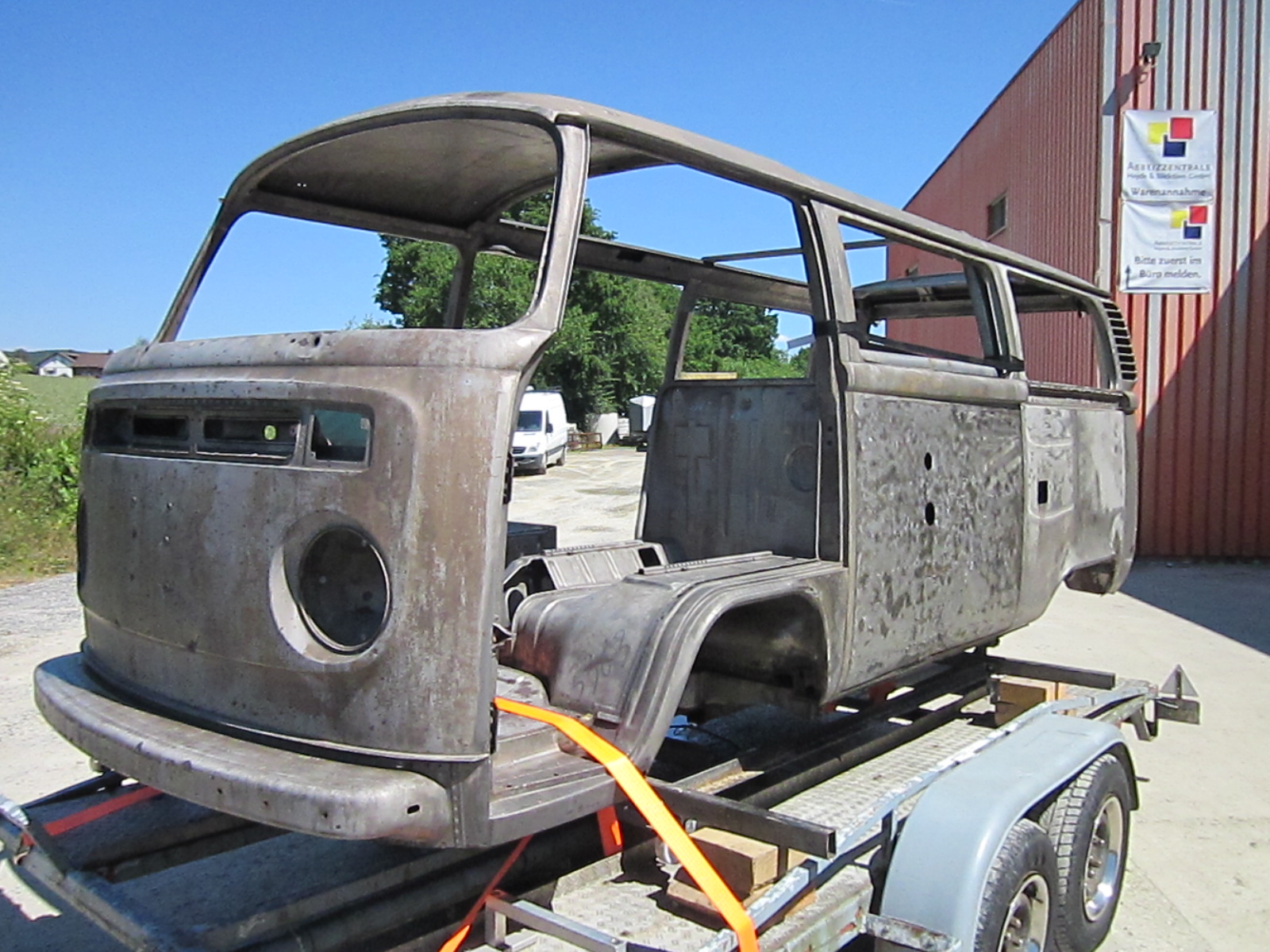 nun geht es weiter. Die Schweissarbeiten sind beendet. Die Karosse ist nun zum entrosten nochmal in einem Tauchbad. Für den Tranport hab ich die kanze Karosse in Folie eingepackt. So sieht der Bulli nun wie ein übergrosses Geschenk aus.....