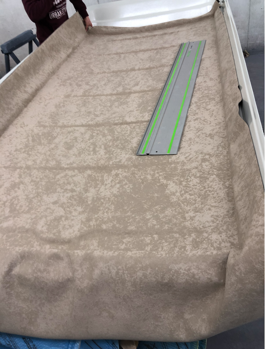 Das Dach hatte eine selbstreingefrickelte Luke. Die haben wir mit Gfk verschlossen. Somit war in einem Feld die Beflockung weg. Das haben wir vom Lackierer dann so wie aussen lackieren lassen. Den Rest der Beflockung haben wir draufgelassen und den Stoff drübergeklebt.