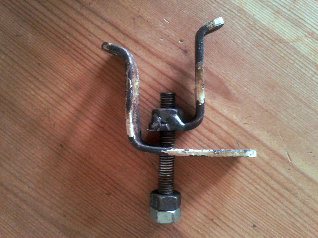 Damit flutscht er fast heraus. Wichtig ist, zwei unverbundene schmale Flacheisenstücke zu nehmen. Dann zuerst das mit der angeschweißten Mutter "einhängen", dann das andere. Danach beide schön gegenüber ausrichten und ein Stück 10mm Gewindestange einschrauben, an deren anderem Ende zwei Muttern gekontert sind. Am besten legt man dann auf das Getriebgehäuse ein dickes Stück Flacheisen quer über den Flansch, um die hereindrehende Gewindestange "aufzufangen". Ich glaube aus den Fotos wirds schlüssig.