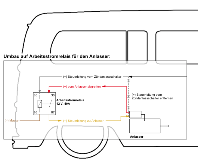 Den geringsten Umbauaufwand hast Du, wenn Du das Relais unmittelbar in die Nähe des Anlassers setzt. Der Nachteil dabei: die Platzverhältnisse da unten sind ekelig und Du musst das Relais hermetisch dicht kriegen. Doch die ganze Vorbereitung kannst du ja vorher in aufrechter Haltung machen und musst nur noch zum Befestigen und zum Anschluss der Kabel unters Auto kriechen.