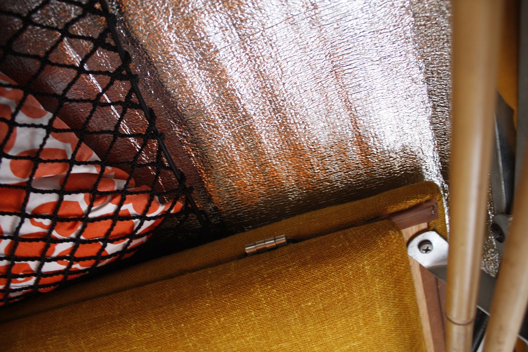 Die Isomatte ist mit Klettband befestigt. Kann rausgenommen werden und als Decke draußen benutzt werden. Sollte mal bisschen dämmen. Bringt aber nix. Keine komische Beflockung von innen am Dach.