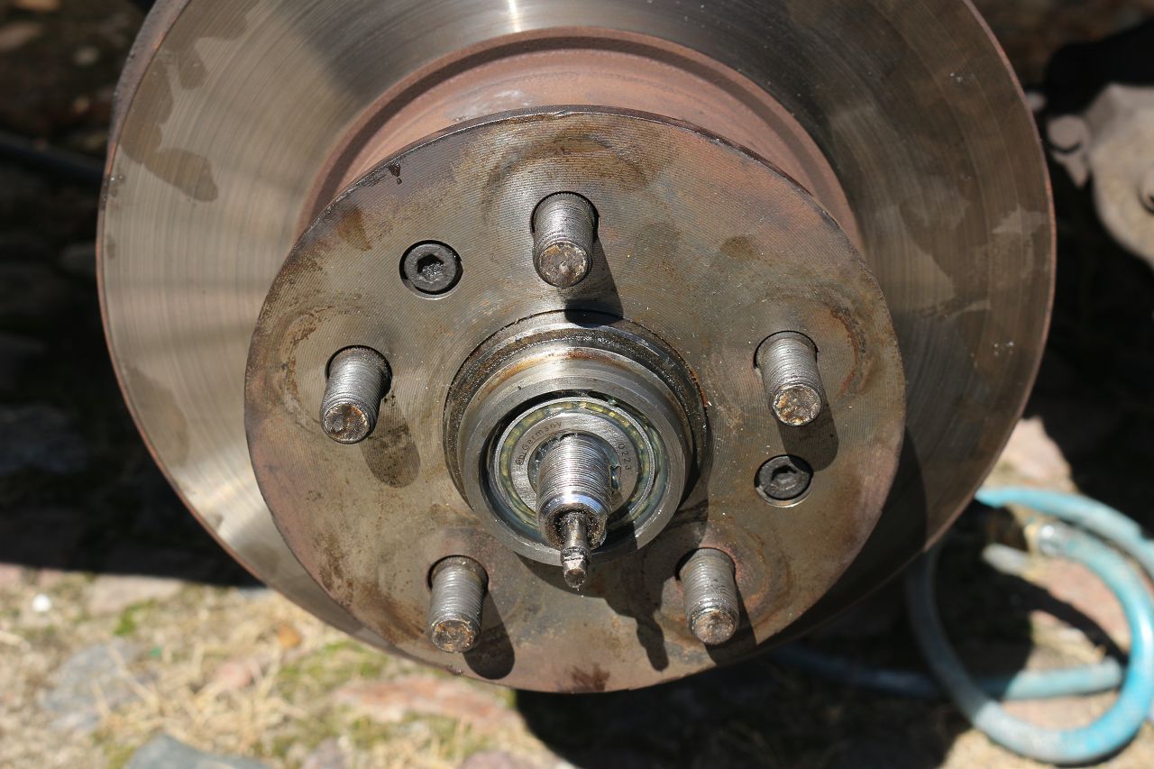 Nabe samt Bremsscheibe vom Achsschenkel abnehemen. Die Kegel-Rollen-Lager sind jetzt lose, können also leicht rausfallen, daher vorsichtig alles sichern beim Abnehmen.