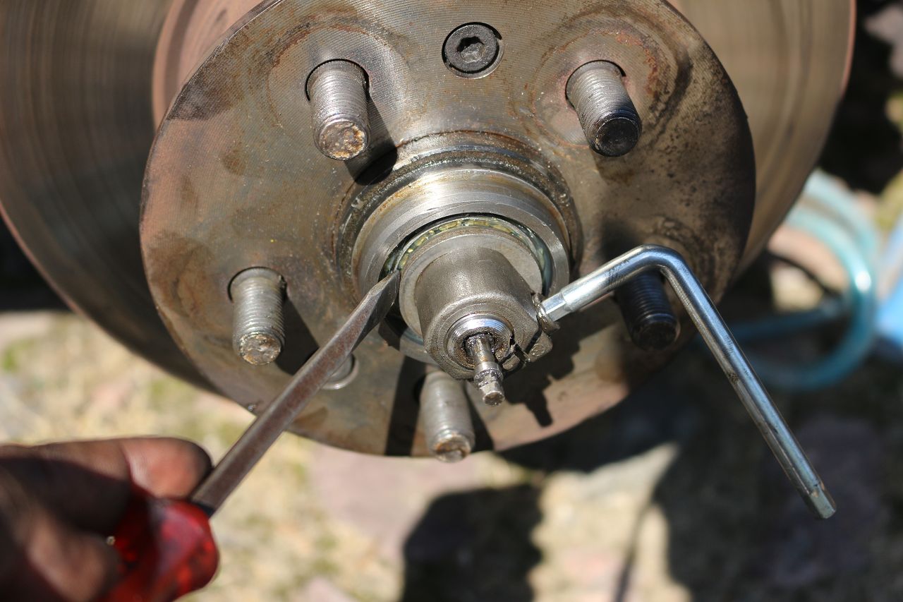 Als erstes wird die Klemmmutter gelöst. Dazu mit 6er Inbus die Sicherungsschraube lösen. Mit dem Engländer die Klemmmutter lösen (fahrerseitig Linksgewinde