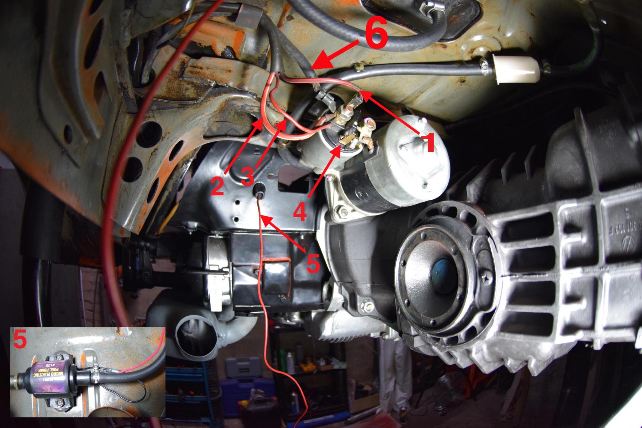 5...........geht mit fliegender Sicherung von der Benzinumpe Richtung Motorraum und ist dort an einem Abzweig an die Zündspule geklemmt