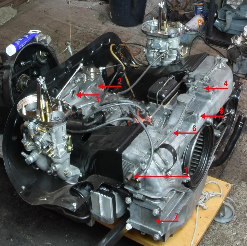 könnt ihr mir nochmal jemand zu den Zahlen im Bild angeben, was es mit diesen Öffnungen / Anflanschpunkten am Motorgehäuse/ Gebläsekasten auf sich hat?