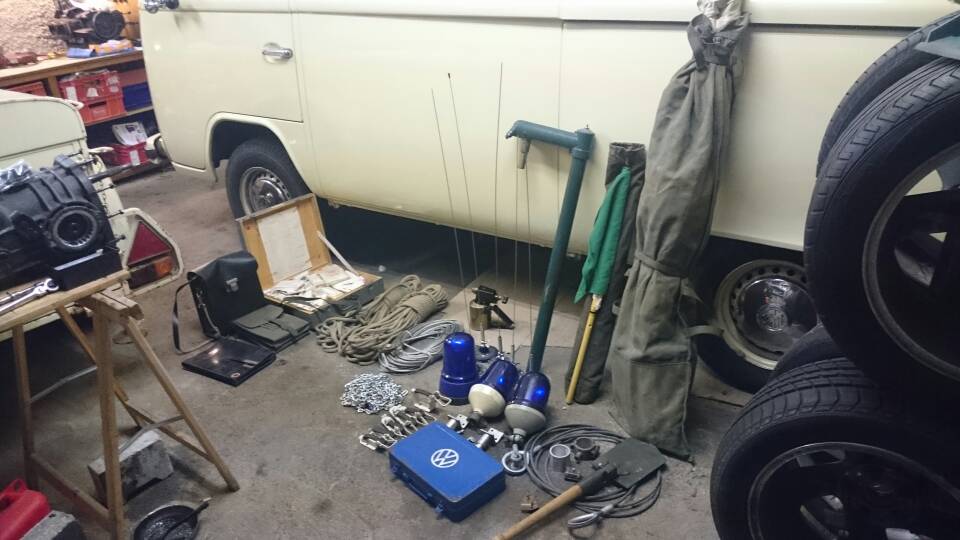 In diesem riesigen Haufen fand ich den fehlenden Fuß und den fehlenden Halter zu meiner Teleskopantenne, diverse Spatenhalter, alte Blaulichter, kleine Antennen fürs 4m-UKW-band, brauchbare Seile, gute Stahlseile, Kleinketten, n süßen alten Petroleumbrenner, den originalen Einsatzsanitätskoffer zu meinem Bus und zwei vollausgestattete Funkertaschen mit Kartenzubehör usw.