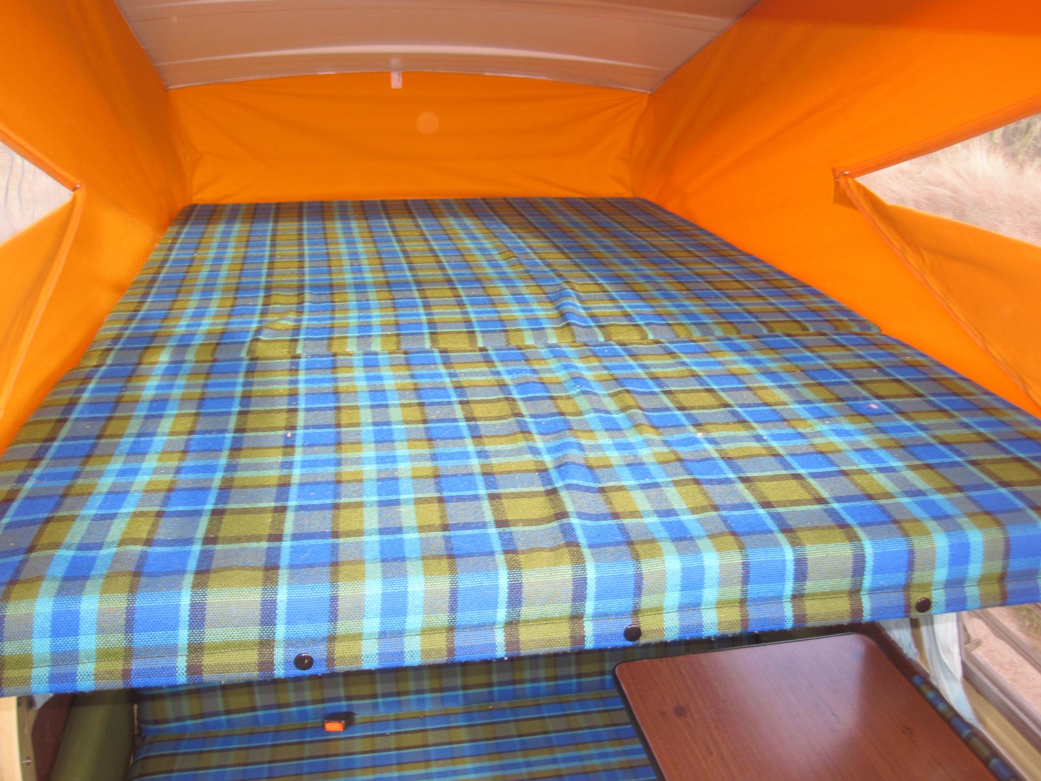 Bilder von innen und aussen (Günzl-Zelt). Die Seitenfester schliessen mit Reissverschluss. Durchreichen funkt wie im Original nur nach vorn zur Gepäckmulde.