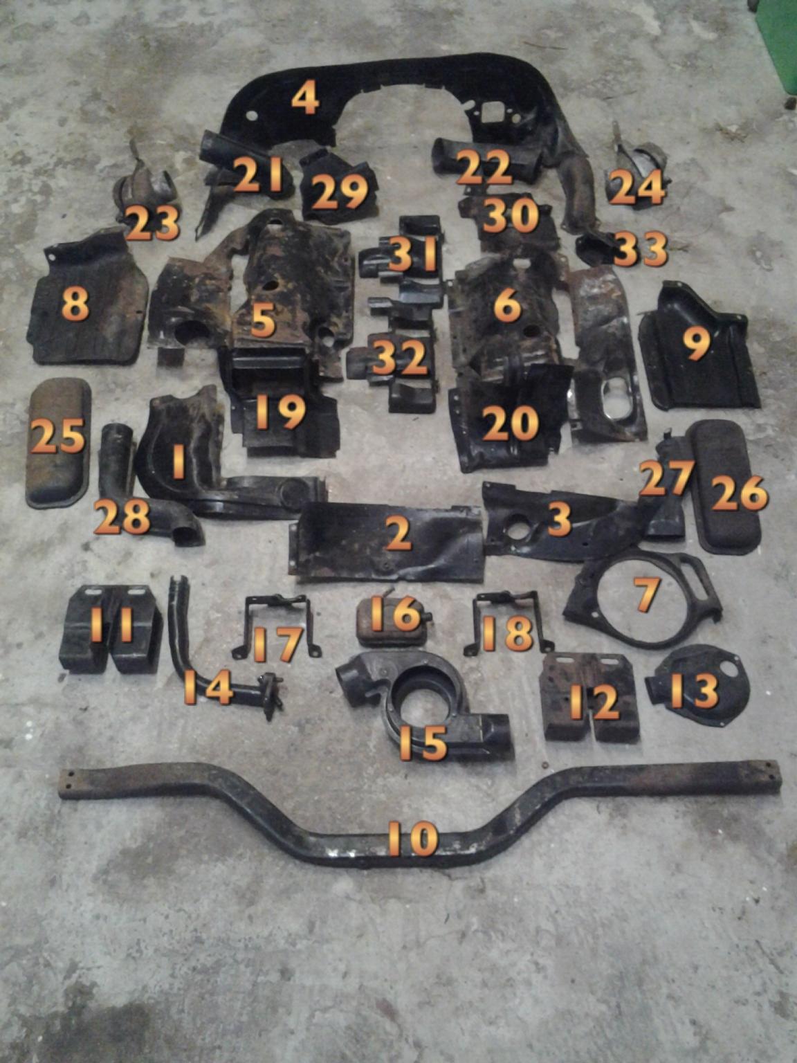 mit Deinen Fotos wird schon einiges klarer. Ist das Bild mit dem Angebot aus dem link? Dort solltest Du die 4 Bleche kaufen, die senkrecht von oben bis unten in der Mitte des Bildes sind. Die gibt es nicht so häufig. Wenn Du sie nur komplett bekommst, nimm sie bei einem brauchbaren Preis trotzdem und verkauf den Rest wieder. Bei den Blechen, die ich Dir angeboten habe, wäre zumindest mal eines für unter die Zylinder dabei. Es fehlt auf jeden Fall noch ein Blick von unten, von vorn nach hinten und beide Seiten. Dann könnte man erkennen, ob auch die Ecken fehlen. Ich kann das Rohr hinter der Motortraverse nicht richtig erkennen. Da würde auf jeden Fall auch noch das Hitzeschutzblech fehlen.