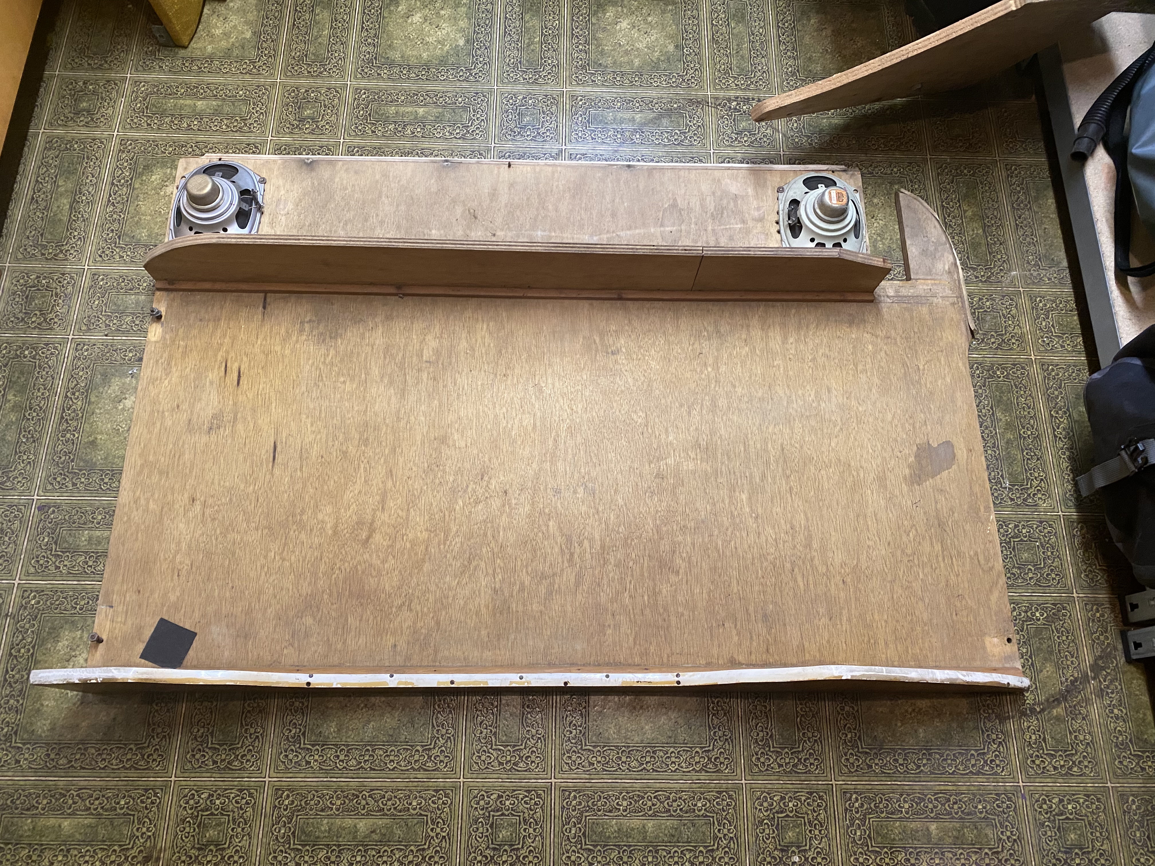 An der Verkleidung der Schlafbank fehlt leider das Furnier und somit auch die Plakette.