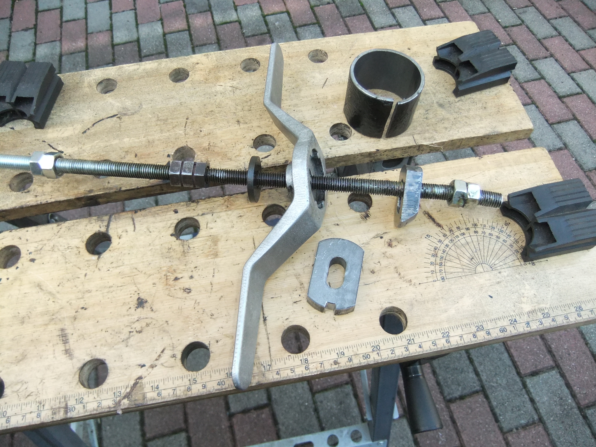 Auszieher für die Nadellager kann man sich aus einer wirklich stabilen Beilagscheibe und einer Gewindestange mit Mutter leicht selber basteln. Die Scheibe muss größer sein, als der Innendruchmesser der Lager und links und rechts parallel abgeschliffen werden, bis sie in einer Richtung kleiner ist, als die Lager. Dann noch Langloch in die mitte, Gewindestange mit Mutter durch und verkippt in und somit hinter das Nadellager einschieben. Beim Ziehen an der Gewindestange sollte sich die Scheibe hinter dem Lager aufrichten. Dann kann man mit Abstützblech und Mutter die Gewindestange mitsamt Lager schön langsam rausziehen.