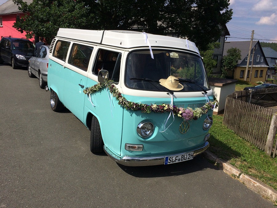 Gestern wars auch bei mir soweit. Meine erste Hochzeit mit dem Bulli. Der alte Ofen war noch nie so herausgeputzt: