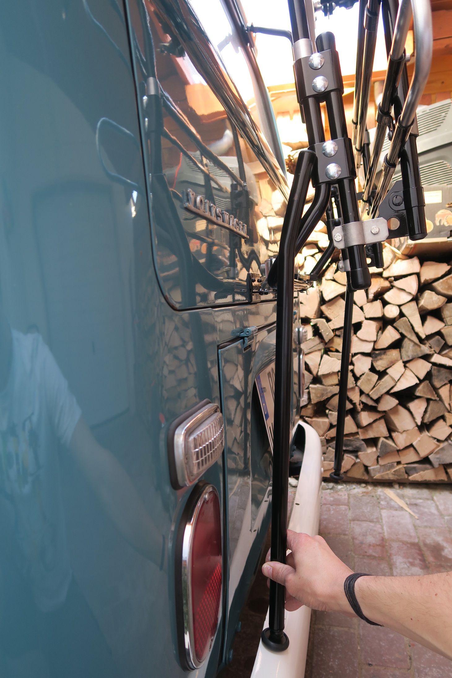ja, ich nehme die Räder immer runter, um die Motorklappe zu öffnen. Man könnte den unteren Bügel im Motorklappenschloß einhängen, dann bleibt die Klappe offen und der Träger steht nach hinten ab. Aber das ist mir zu "unheimlich" , wenn ich da mit dem halben Oberkörper im Motorraum hänge, das mir die ganze Chose auf den Rücken kracht.