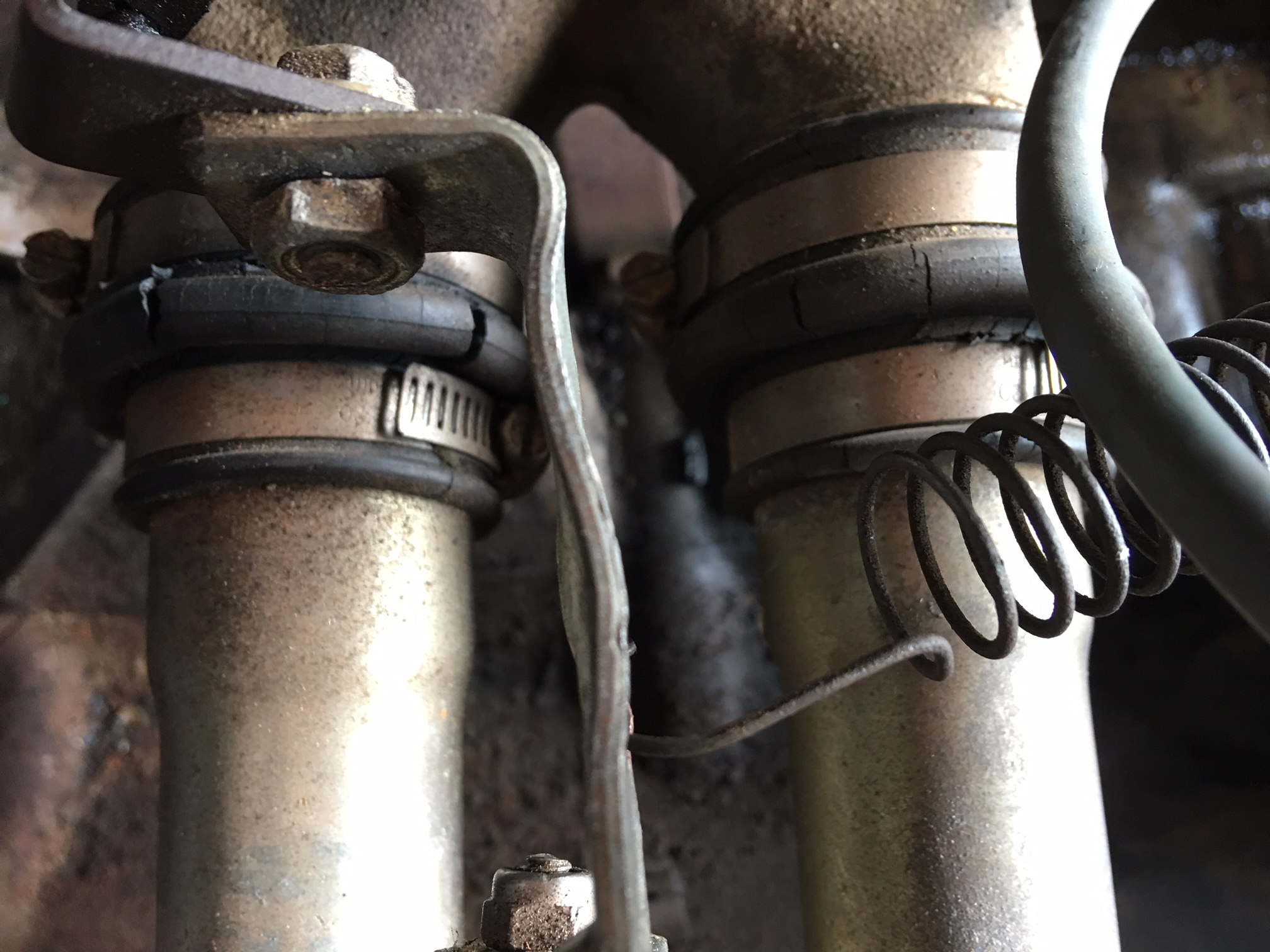 ich hatte meine raus, da ich auch die Dichtungen zum Kopf hin erneuert hatte. Ich meine mich erinnern zu können, das der Spalt zwischen Zentralvergaser und den Rohren recht knapp bemessen war und die Gummimanschetten da nicht genug Platz hatten.
