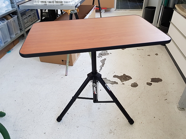 ich habe es mir ganz einfach gemacht. Hab nen alten Campingtisch geschlachtet, Halterungen und Beine weiterverwendet, ein wenig gesägt und das Ganze mit 3m Power Locks unter dem Tisch befestigt.