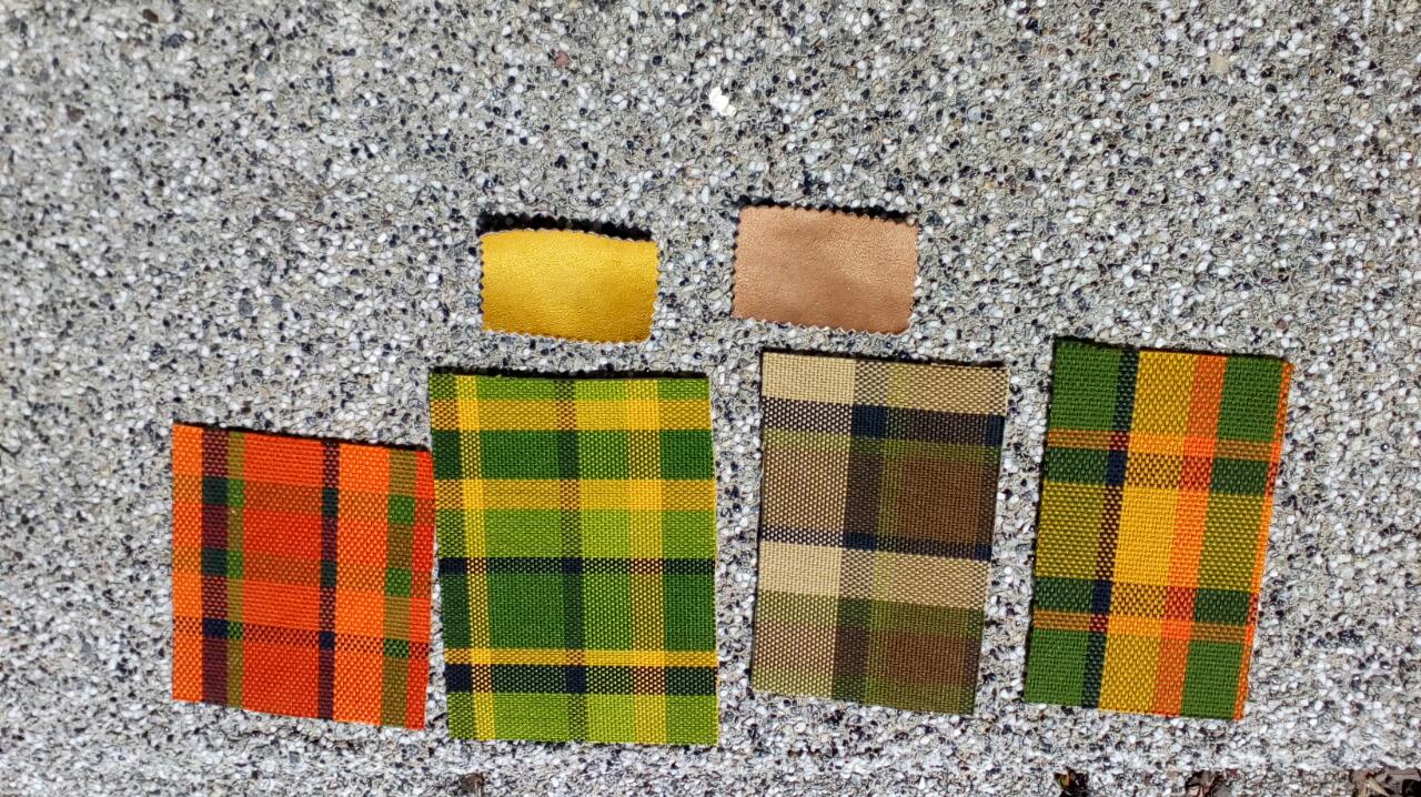 Hellbraun und Ocker. Das Ocker kommt dem gelben Kunstleder farblich sehr nahe. Ist zwar vom Material nicht passend - dafür aber absolut stabil und atmungsaktiv. Den Stoff habe ich schon als Stuhlposter verarbeitet; sehr gute Qualität