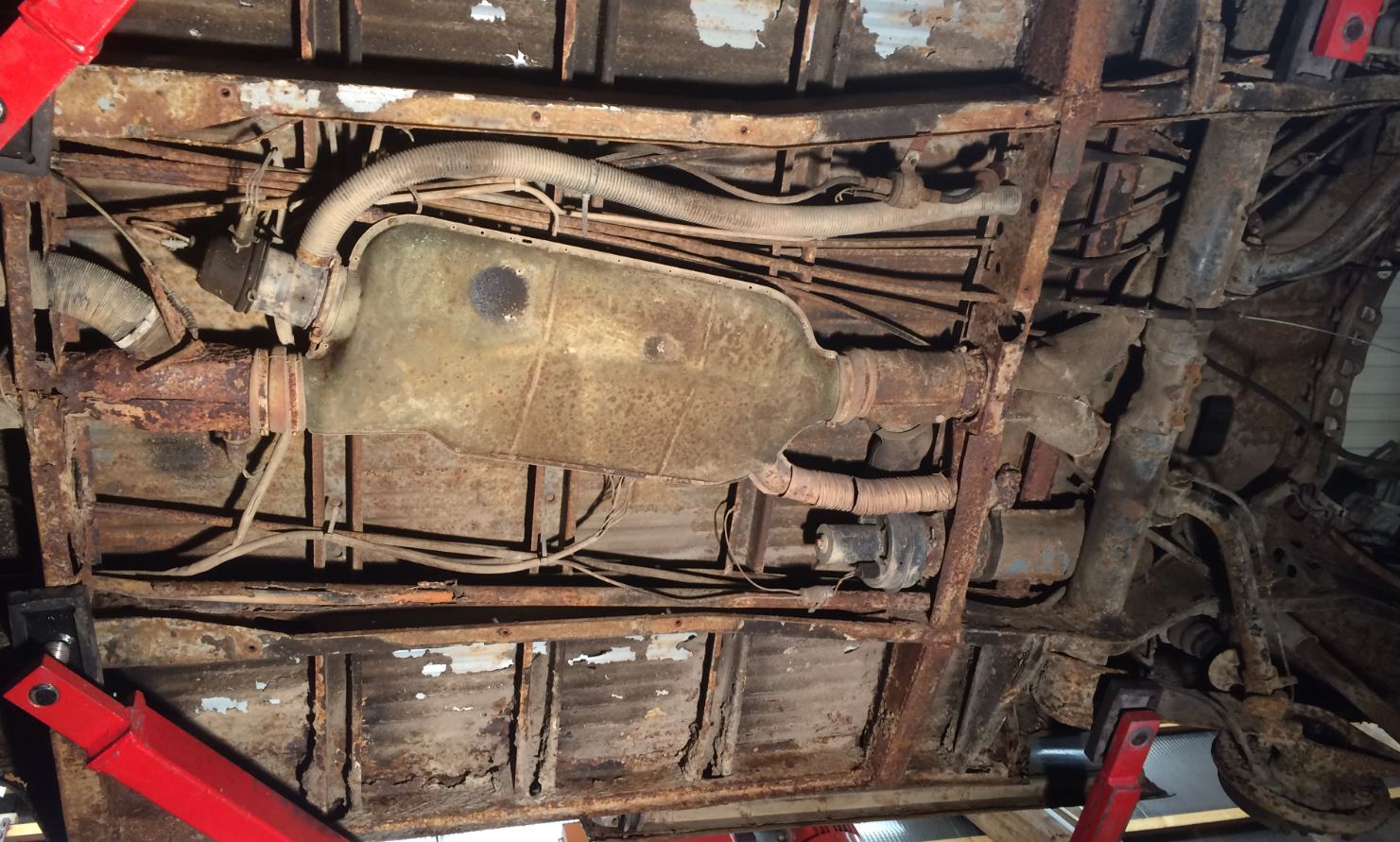 Bin noch ganz am Anfang und daher noch voll motiviert. Habe den Bulli gerade zerlegt und will jetzt die erhaltenswerten Teile des Unterbodens stahlen.