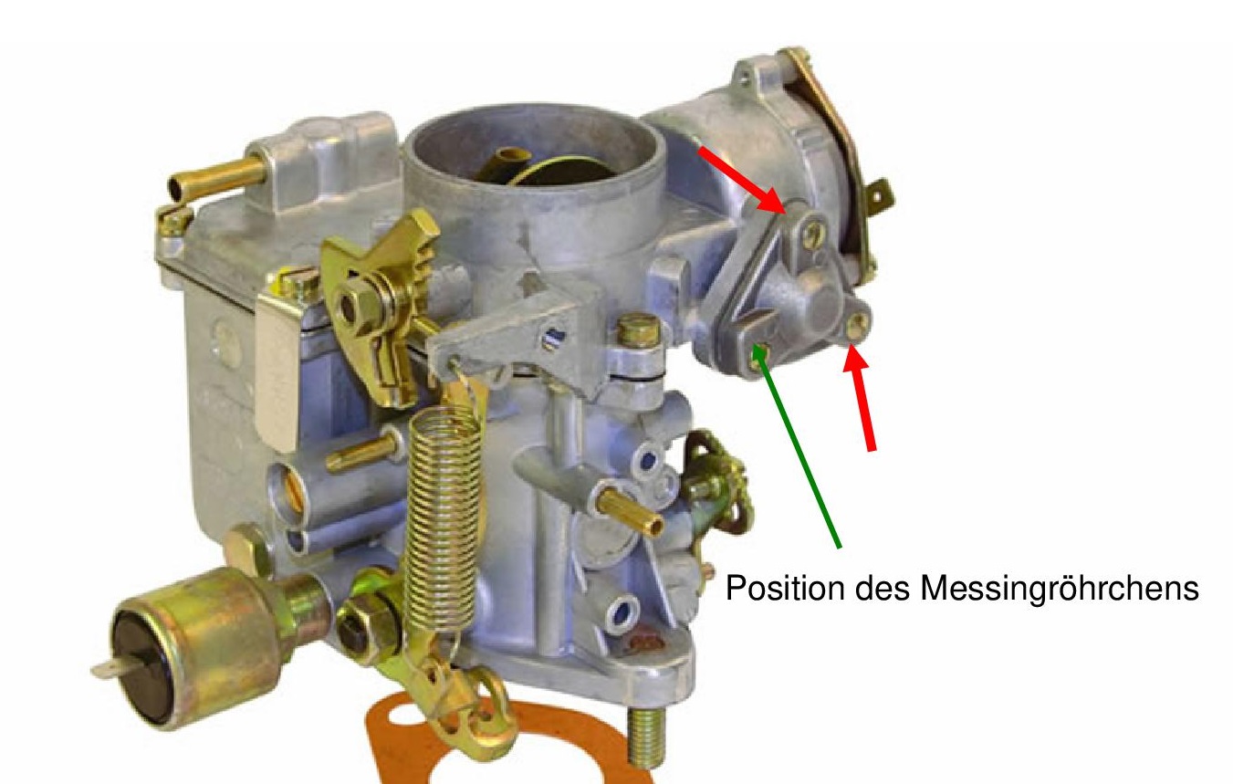 … und noch etwas zum Vergaserworkshop: Das Austrittsrohr für die Beschleunigerpumpe ist so einzustellen, dass der Strahl auf die Kante des Austrittsarmes trifft. Nur so ist eine optimale Zerstäubung gewährleistet. Der Verfasser des Workshops geht da leider eigene Wege, welche nicht konform zur Einstellanweisung von VW sind.