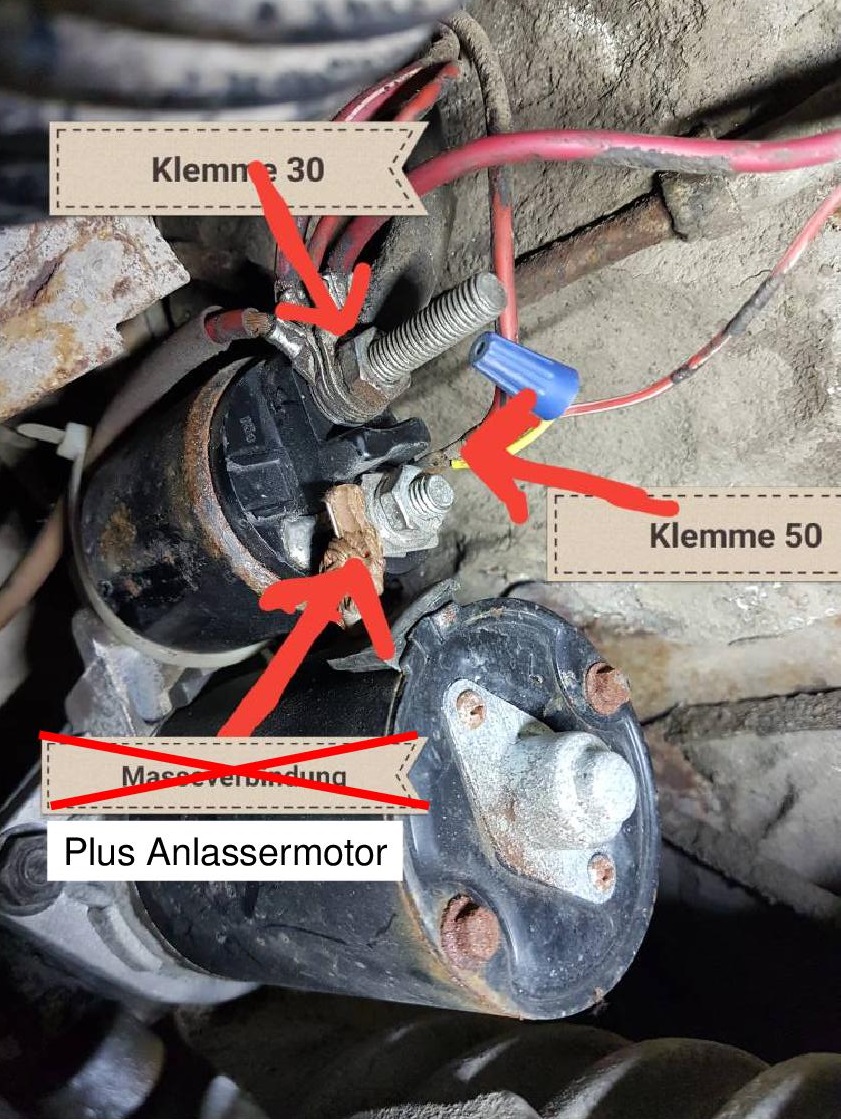 Klemme 30 (Batt. +) mit Klemme 50 des Magnetschalters über einen Drucktaster (Strombelastung mind. 35 A ) verbinden.