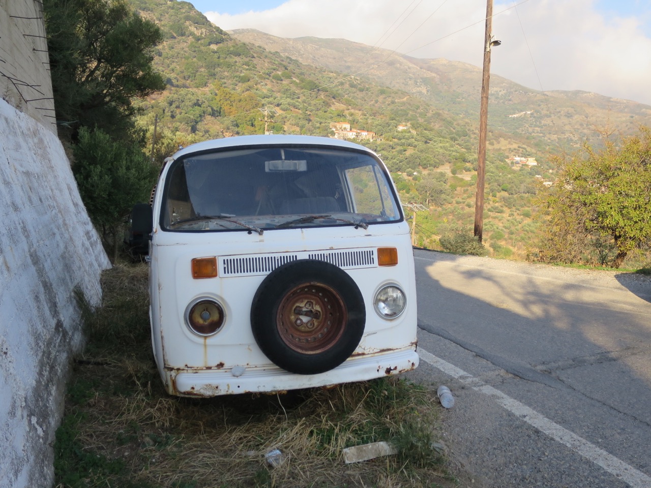 Dieses Exemplar ist gewiss unbezahlbar. Es steht offenbar seit Jahren prominent vor einer Kurve auf der Küstenstrasse bei Kefali im Westen von Kreta. Passt auch zum Thread "Wenn Bullis sterben..."