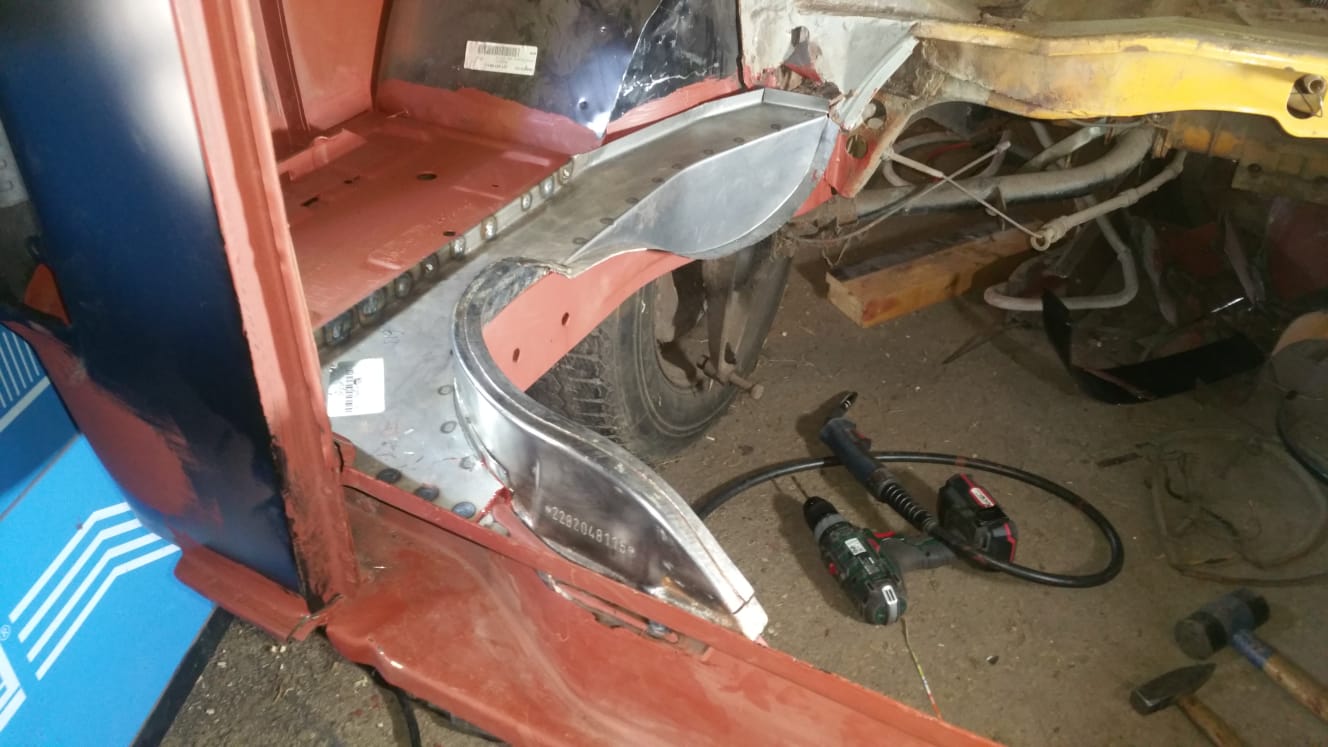 Anmerkung: Das Kniestück war in sich verdreht, so dass die Tür nicht zugemacht werden konnte. Auf der B-Säulen Seite war es nicht Plan, der innere Teil guckte weiter raus, aus diesem Grund war es nicht bündig zur B-Säule. Nach dem ich die Widerstandsschweißpunkte aufgebohrt hatte, hat sich das äußere Teil entspannt und passt perfekt. Die Tür geht zu, schöner gleichmäßiger Spaltverlauf auch bei der Tittstufe.